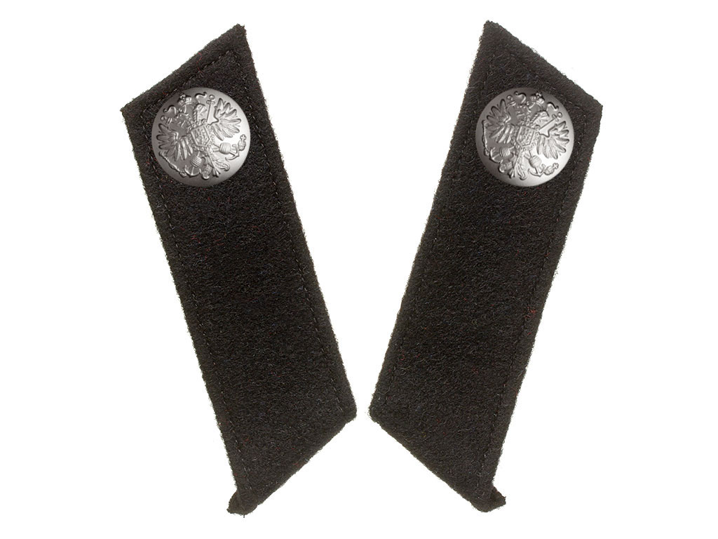 Качественная копия петлиц на шинель унтер-офицера морских строительных частей и морской администрации Российского Императорского флота (после 1904 года). Черное суконное поле, черный кант, белые пуговицы с изображением Государственного герба на якорях.