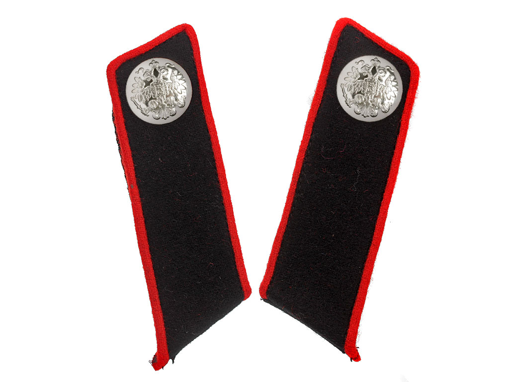 Качественная копия петлиц на шинель офицера Генерального Штаба, либо гусарских полков, либо интендантской службы. Черное суконное поле, красный кант, посеребренные пуговицы с изображением Государственного герба.