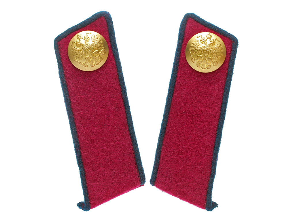Качественная копия петлиц на шинель унтер-офицера 3-го Новороссийского драгунского полка. Малиновое суконное поле, лазоревый кант, латунные пуговицы с изображением Государственного герба.