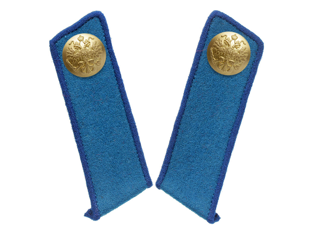 Качественная копия петлиц на шинель унтер-офицера 2-го, 6-го и 10-го уланских полков. Светло-синее суконное поле, темно-синий кант, латунные пуговицы с изображением Государственного герба.