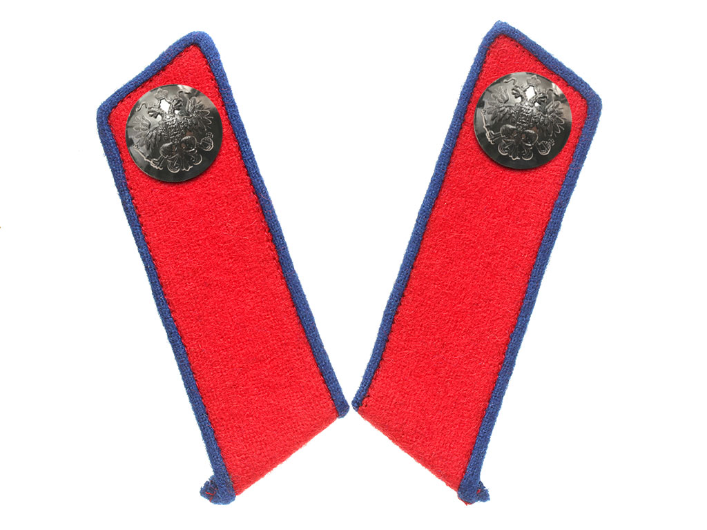 Качественная копия петлиц на шинель унтер-офицера 5-го уланского Литовского полка. Красное суконное поле, темно-синий кант, посеребренные пуговицы с изображением Государственного герба.