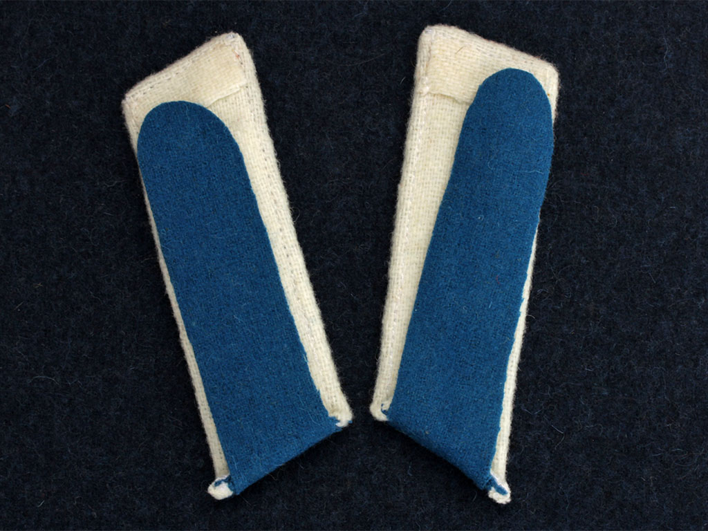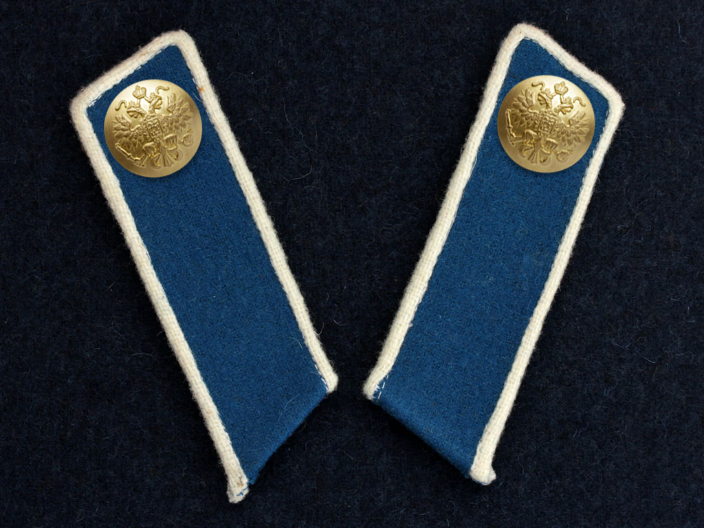Качественная копия петлиц на шинель унтер-офицера 6-го драгунского Глуховского, 12-го драгунского Стародубовского, а также 3-го гусарского Елисаветградского полков. Голубое суконное поле, белый кант, латунные пуговицы с изображением Государственного герба.