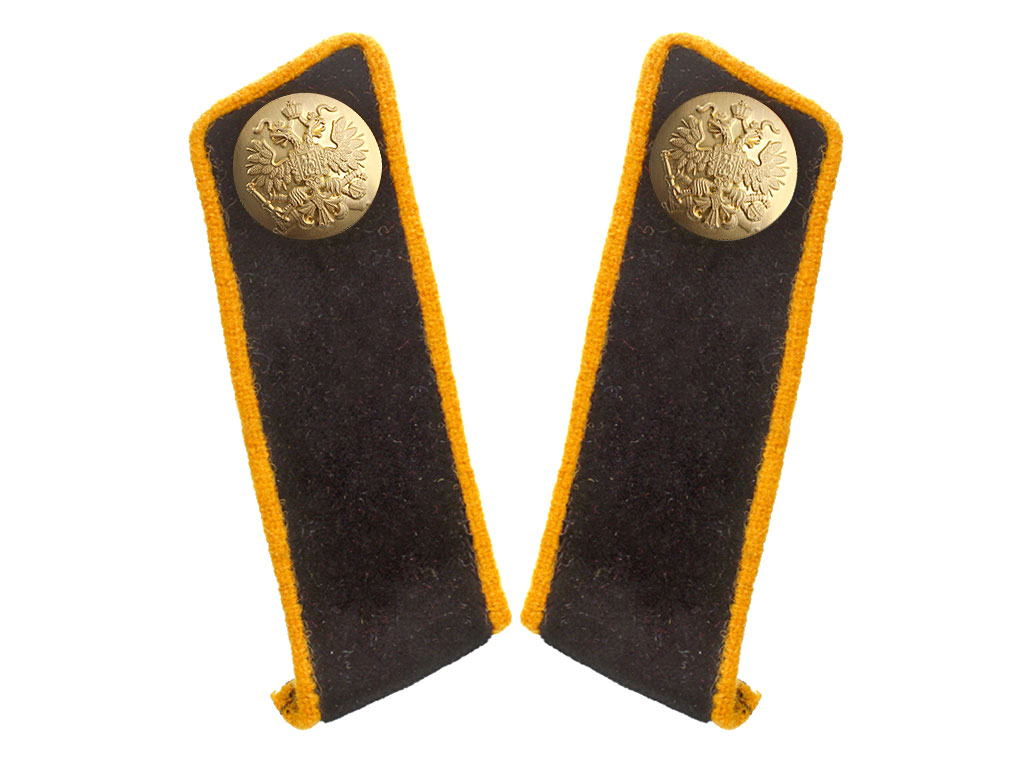 Качественная копия петлиц на шинель унтер-офицера Лейб-гвардии 3-й артиллерийской бригады. Черное бархатное поле, желтый кант, латунные пуговицы с изображением Государственного герба на пушках.