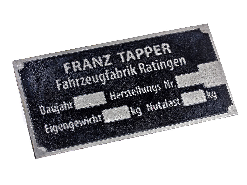 Табличка FRANZ TAPPER Fahrzeugfabrik Ratingen для прицепов. Германия, копия, (состаренный вид)
