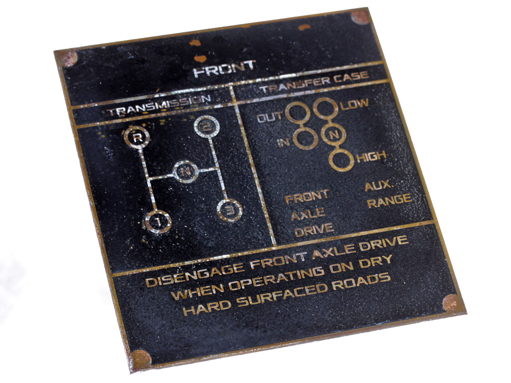 Табличка для обозначения коробки передач на армейские автомобили WILLYS. США, копия. Состаренный вид.