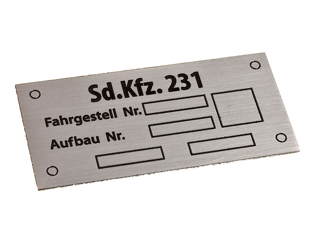 Табличка Sd.Kfz 231, центральная алюминиевая табличка броневика. Сделана на основе оригинала, монтируется изнутри боевого отделения между бронезаслонками водителя и радиста, на большинстве сохранившихся машин отсутствует.