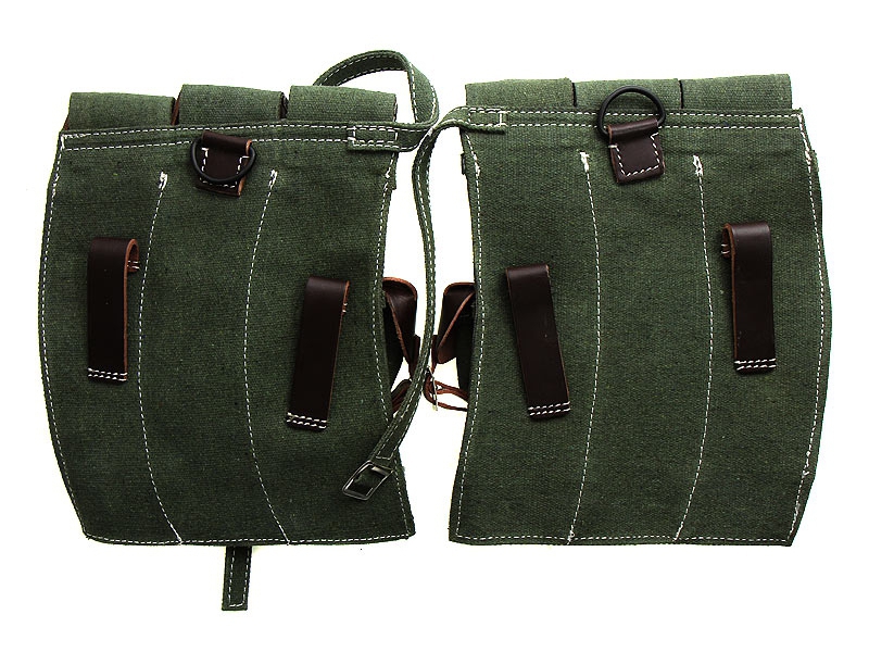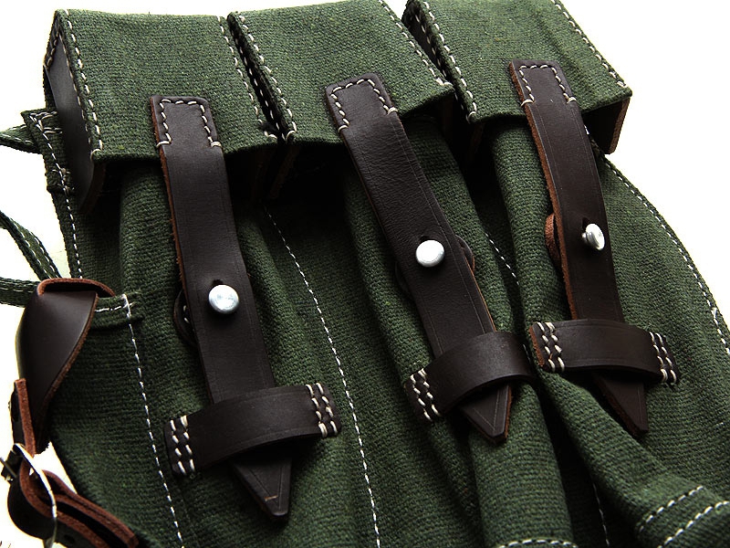Такой же, но несколько больший карман пришивался к левому подсумку; в нем находилась ружейная принадлежность и мелкие запасные детали. (Некоторые подсумки, выпускаемые в конце войны, не имели этих карманов). Эти два тройных подсумка были соединены друг c другом тонким регулируемым ремешком из тесьмы, который огибал шею автоматчика сзади, этот ремешок часто снимали. С задней стороны подсумков были две расположенные под углом петли, в которые вдевался поясной ремень, и D-образное кольцо, за которое пристегиваласьлямка поддерживающих ремней.