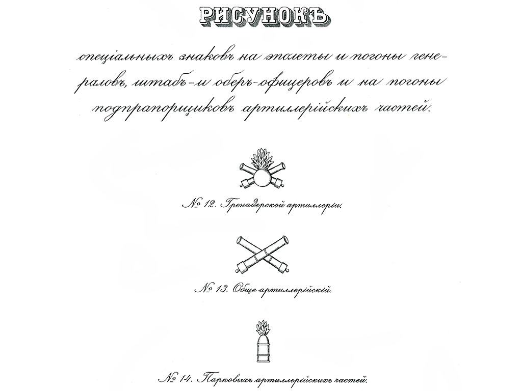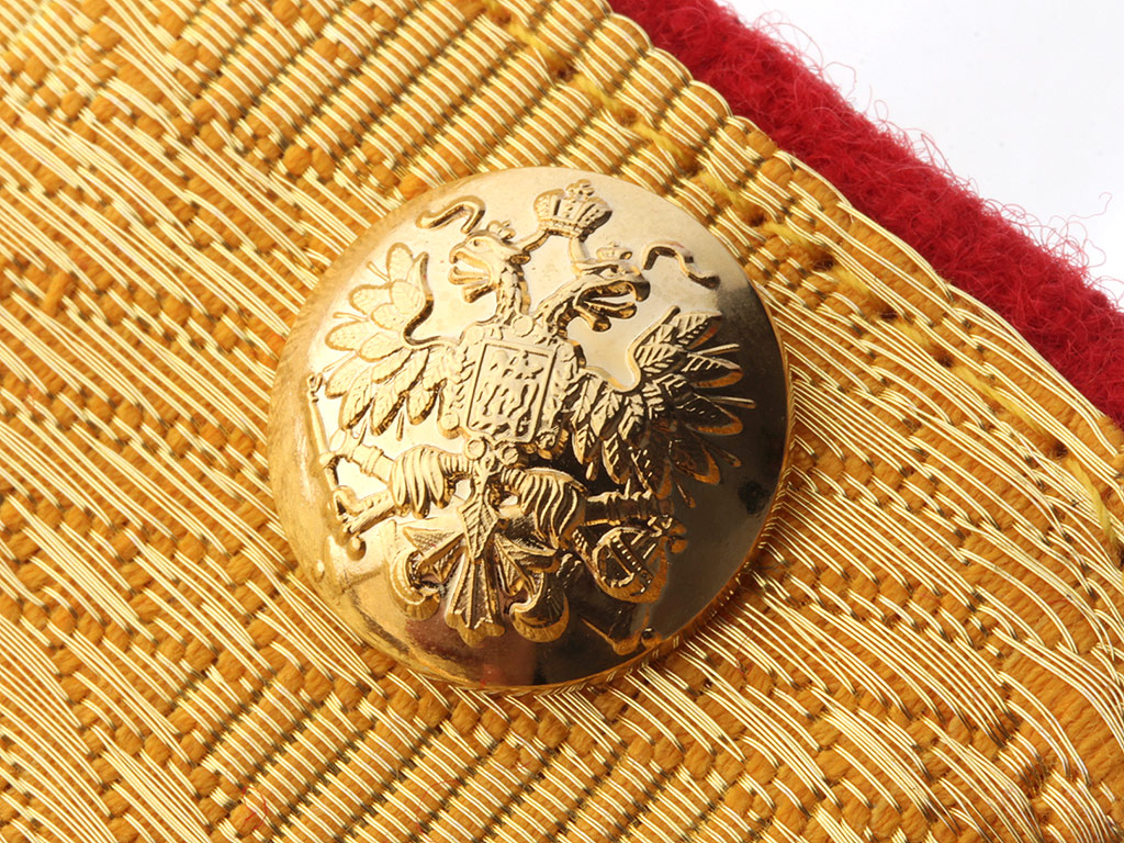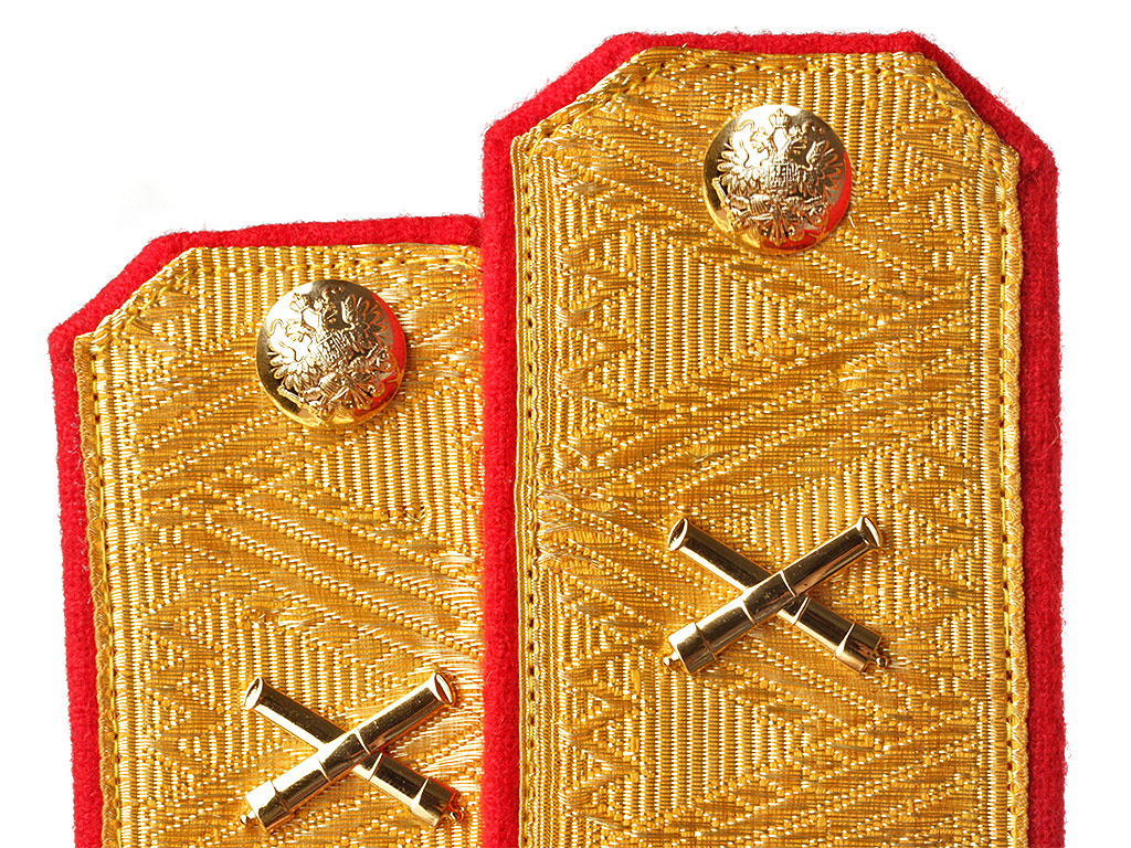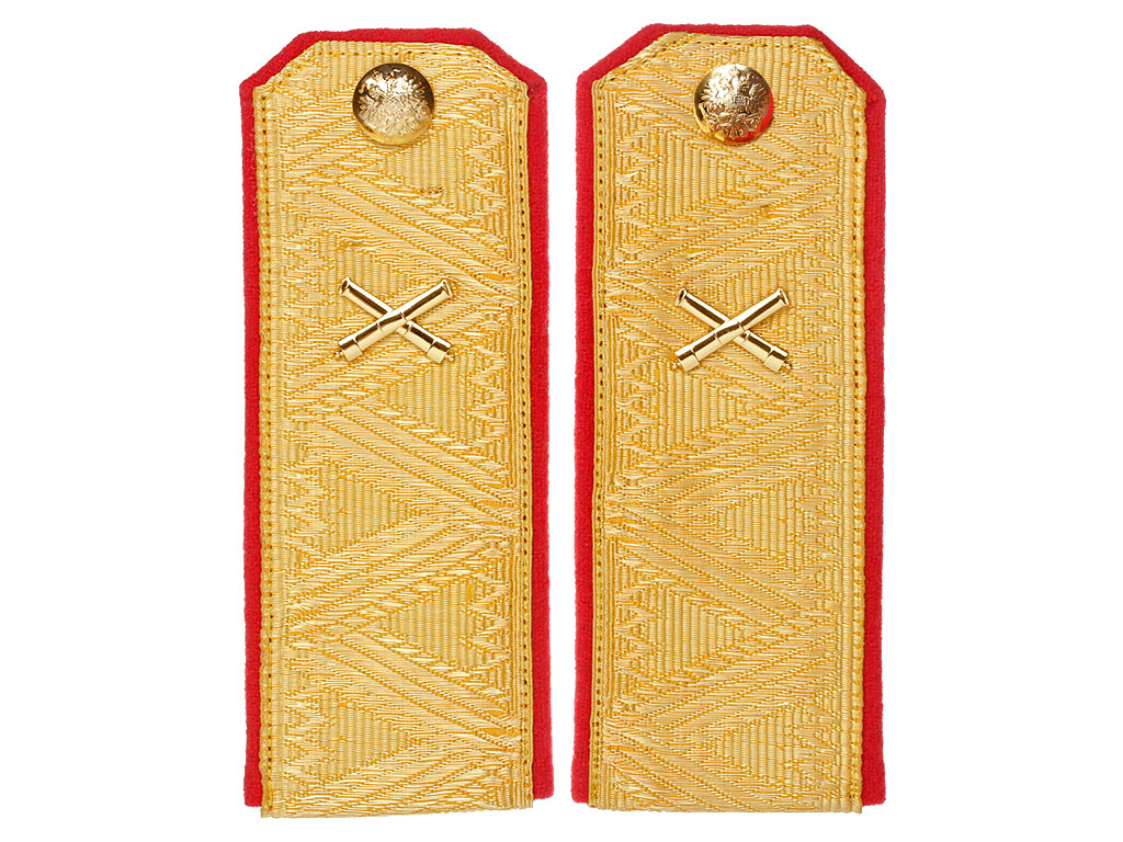 Погоны генерала армейской и гвардейской пешей артиллерии Русской Императорской Армии. Желтое металлизированное золотое поле с зигзагообразной генеральской вышивкой, красный кант. Золотые пуговицы с изображением Государственного герба на пушках, погонные эмблемы (специальные знаки) в виде золотых скрещенных орудийных стволов.
