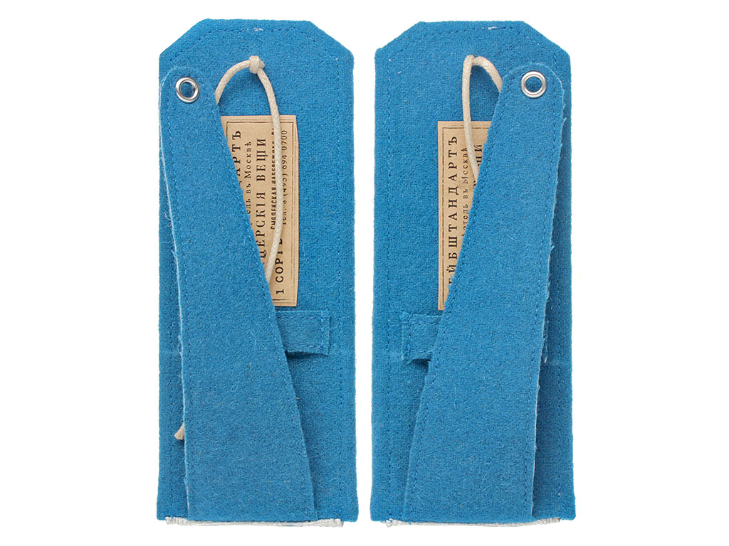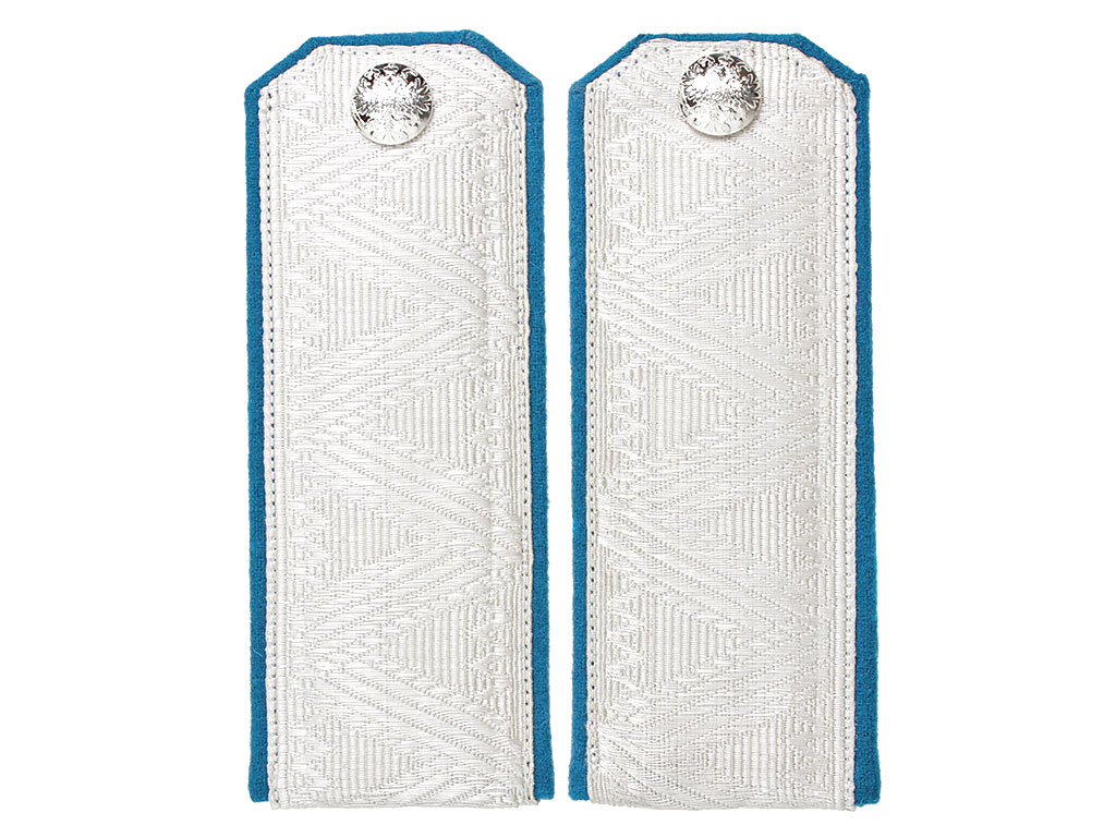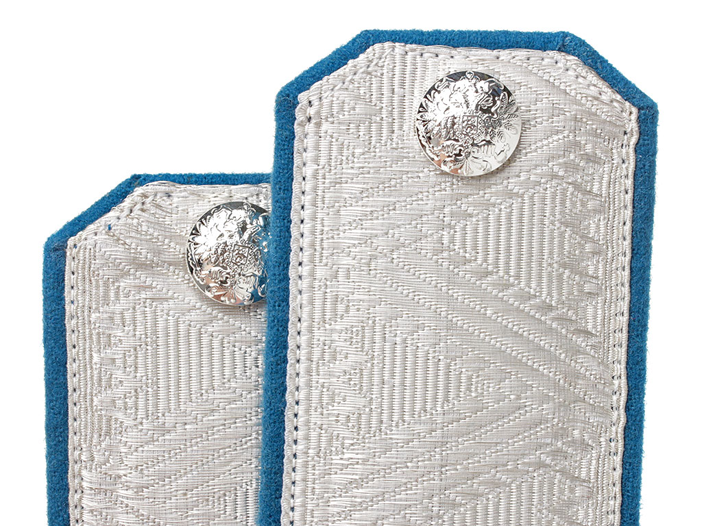 Погоны генерала для ношения при форме Лейб-гвардии Атаманского полка Русской Императорской Армии. Белое металлизированное серебряное поле с зигзагообразной генеральской вышивкой, голубой кант. Серебряные пуговицы с изображением Государственного герба.