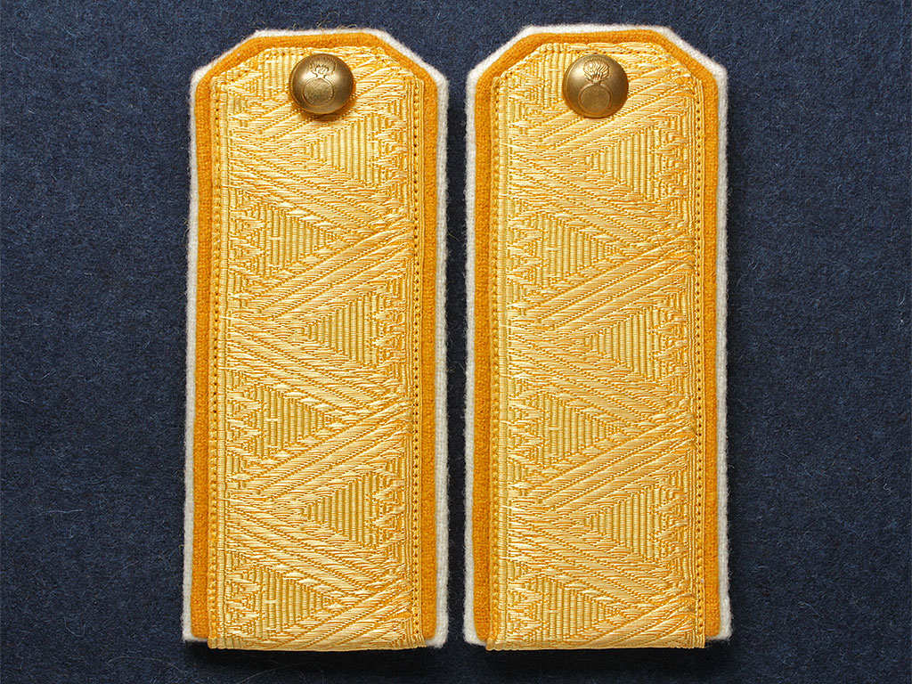 Погоны генеральские для ношения при форме 12-го гренадерского Астраханского Императора Александра III полка. Желтое металлизированное золотое поле с зигзагообразной генеральской вышивкой, двойным желтым и белым подбоем, латунные пуговицы с изображением пылающей гренады.