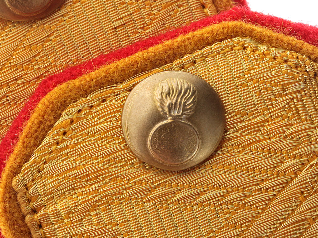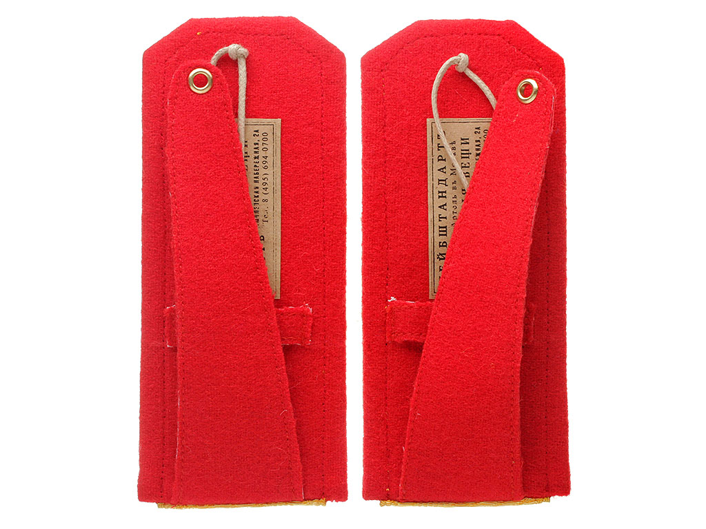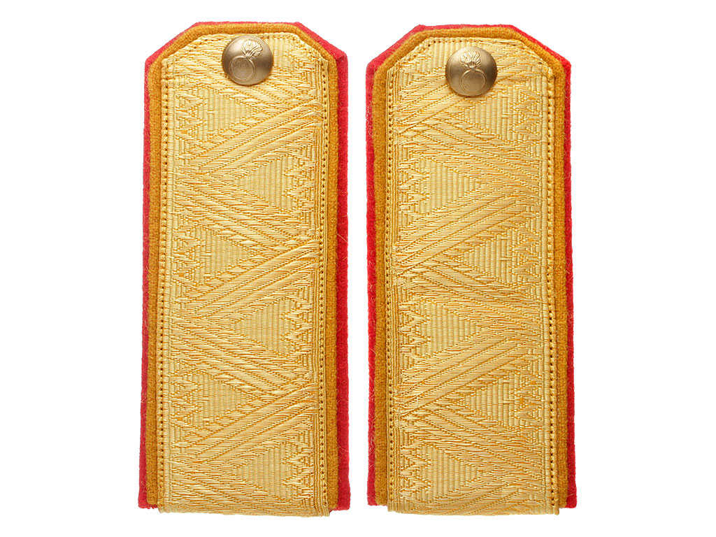Погоны генеральские для ношения при форме 1-го лейб-гренадерского Екатеринославского, 2-го гренадерского Ростовского, 3-го гренадерского Перновского, 4-го гренадерского Несвижского полков, входивших в состав 1-й гренадерской дивизии. Желтое металлизированное золотое поле с зигзагообразной генеральской вышивкой, желтым кантом и красным подбоем, латунные пуговицы с изображением пылающей гренады.