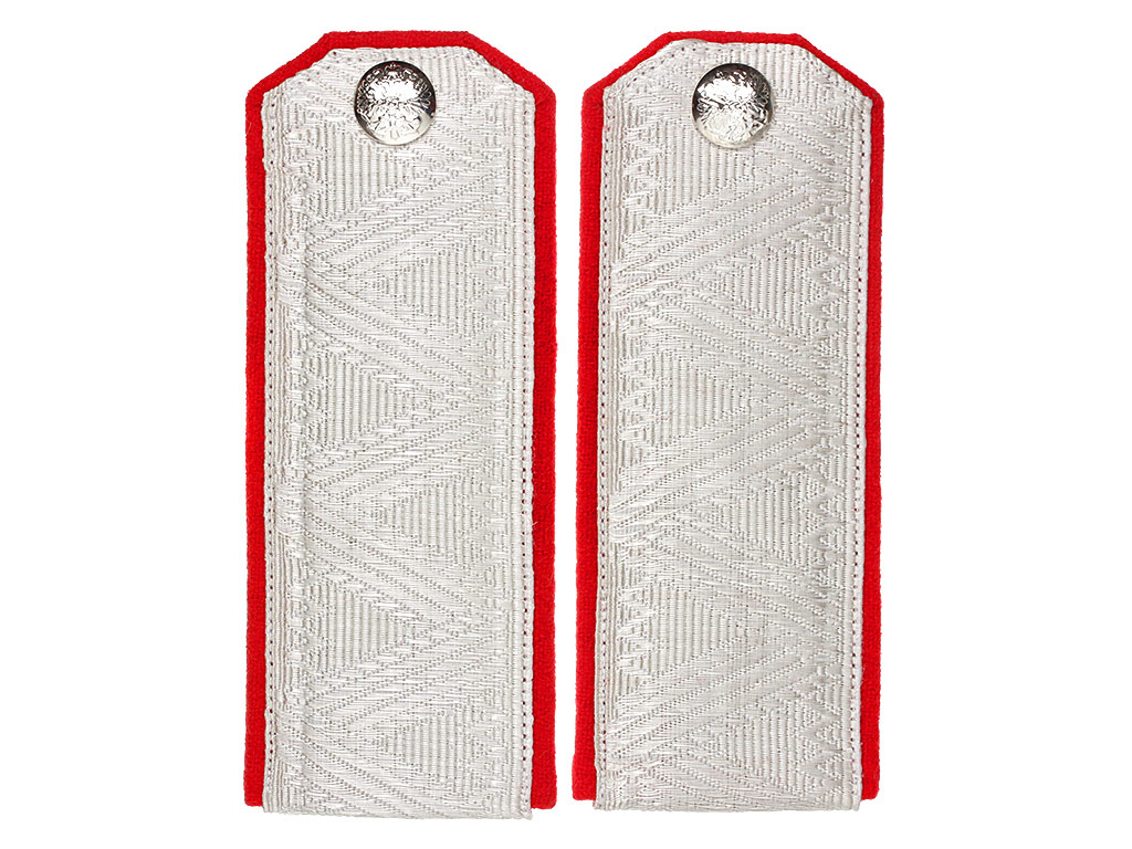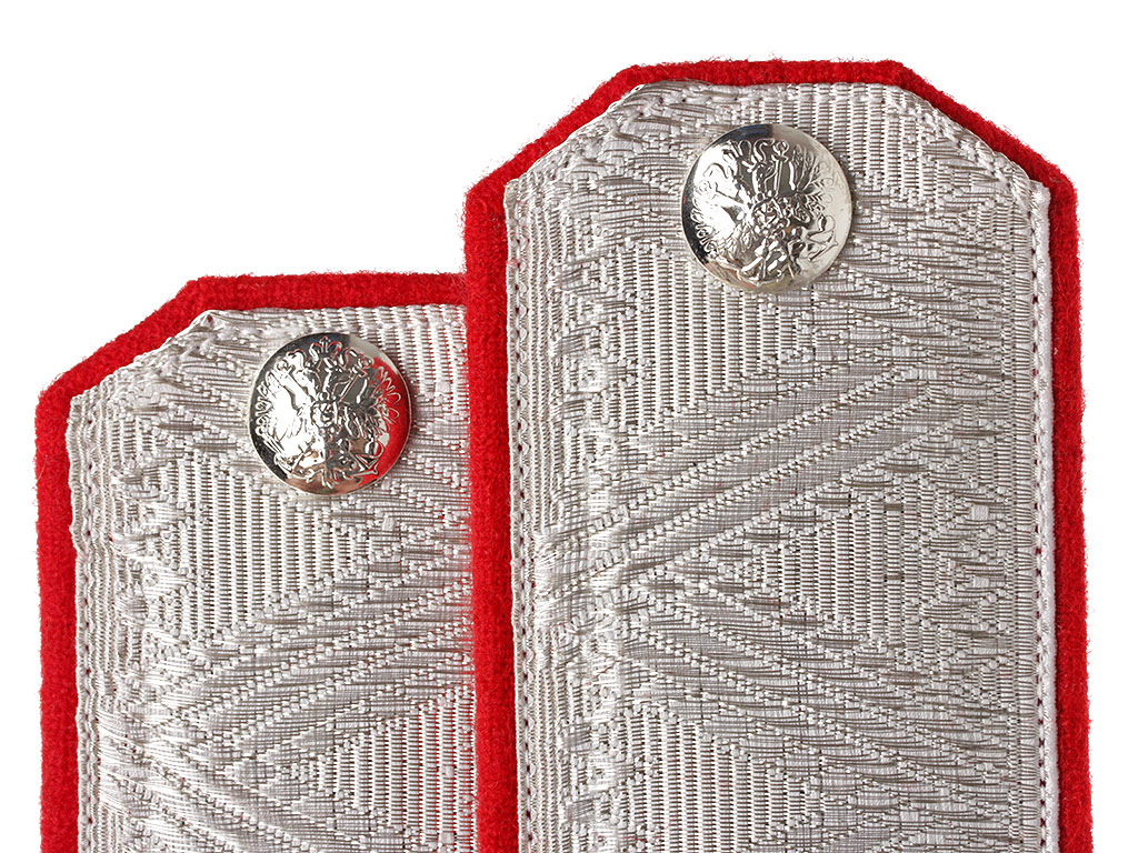 Погоны генерала морской строительной части Русской Императорской Армии. Белое металлизированное серебряное поле с зигзагообразной генеральской вышивкой, красный (алый) кант. Серебряные пуговицы с изображением Государственного герба на якорях.