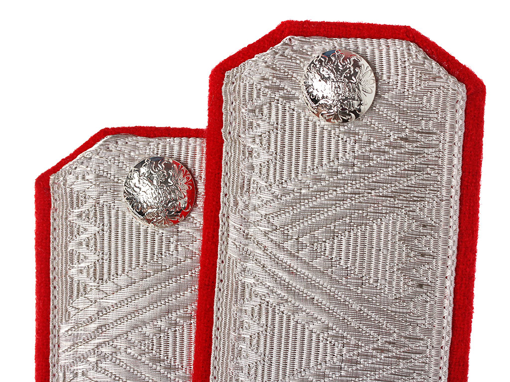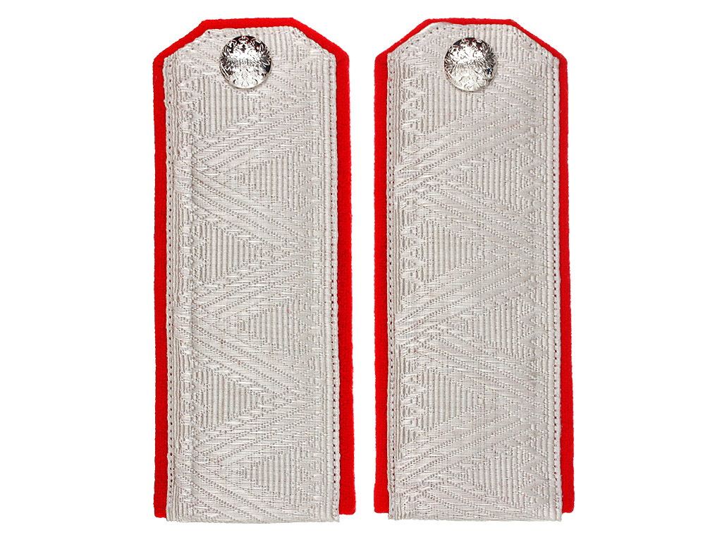 Погоны гвардейского генерала Русской Императорской Армии. Белое металлизированное серебряное поле с зигзагообразной генеральской вышивкой, красный (алый) кант. Серебряные пуговицы с изображением Государственного герба.