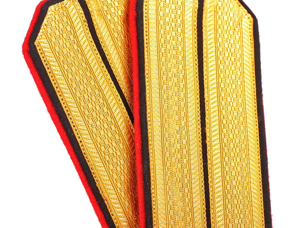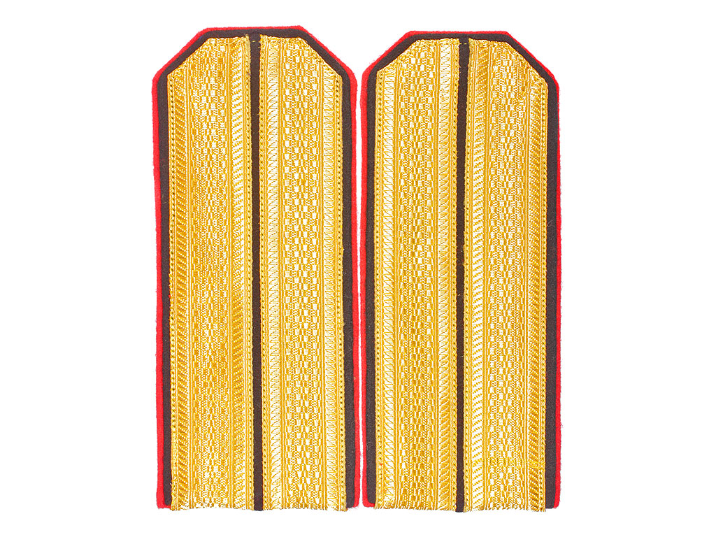 |Погоны обер-офицерские Морской Артиллерии Русского Императорского Флота. Желтое металлизированное поле, черный просвет, алая основа, двойной кант (алый и черный). Россия, копия