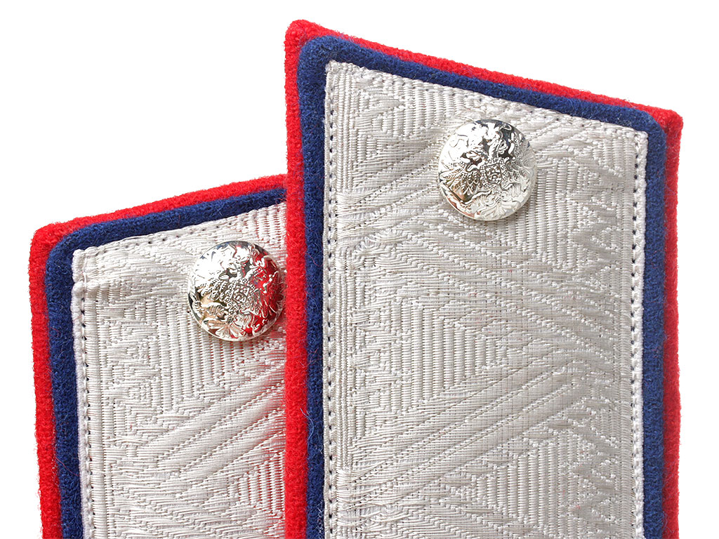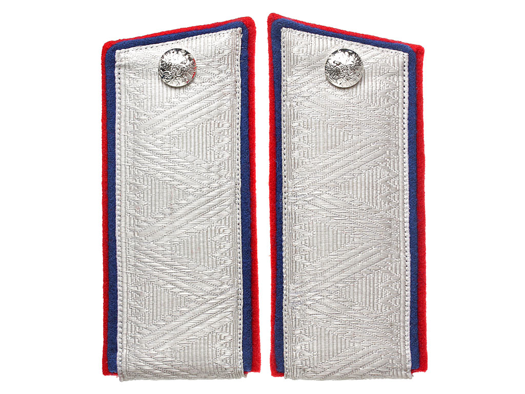 Погоны на пальто генерала от кавалерии Донского казачьего войска. Белое металлизированное серебряное поле с зигзагообразной генеральской вышивкой, синий кант с красным (алым) подбоем. Серебряные пуговицы с изображением Государственного герба.