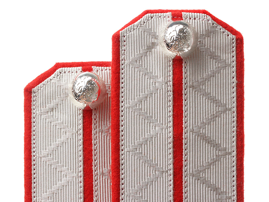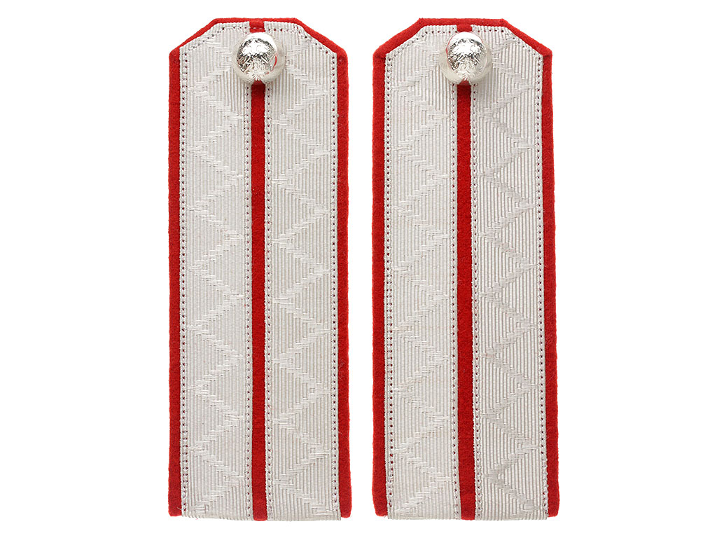 Белое металлизированное поле, красный просвет, красная основа. Серебряные дутые пуговицы с изображением Государственного герба.