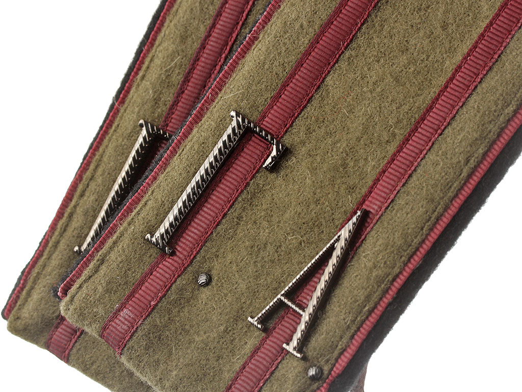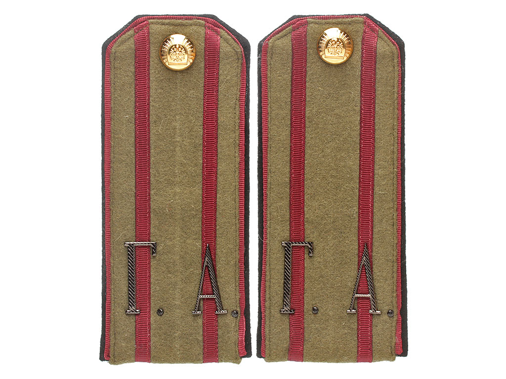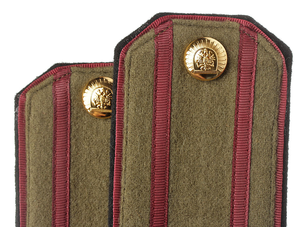 Качественная копия погон для походной формы полковника - преподавателя Нижегородского графа Аракчеева кадетского корпуса. Малиновые просветы и поле, черный кант. Установлены вороненые шифровки "Г.А." и пуговицы с "сиянием".