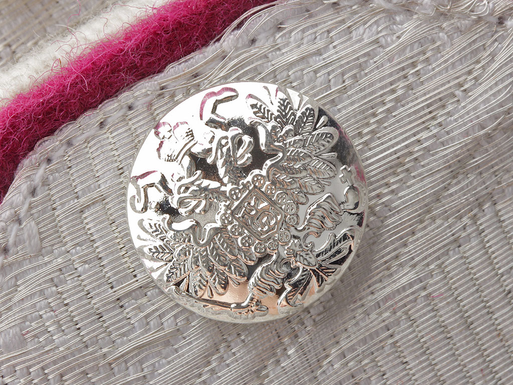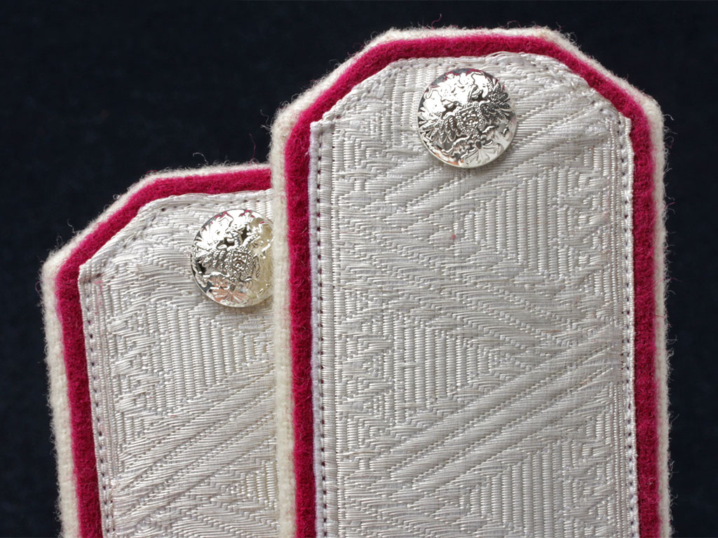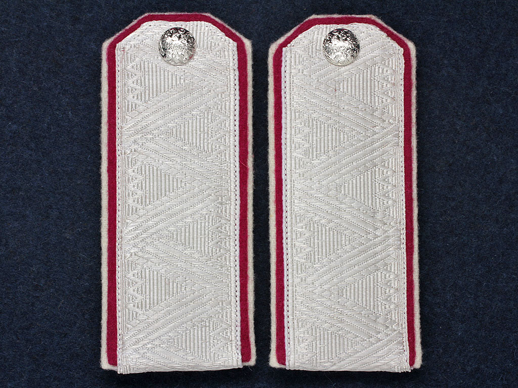 Погоны генерала от кавалерии 1-й Уральской сотни Лейб-гвардии Сводно-Казачьего полка Русской Императорской Армии. Белое металлизированное серебряное поле с зигзагообразной генеральской вышивкой, малиновый кант с белым подбоем. Серебряные пуговицы с изображением Государственного герба.