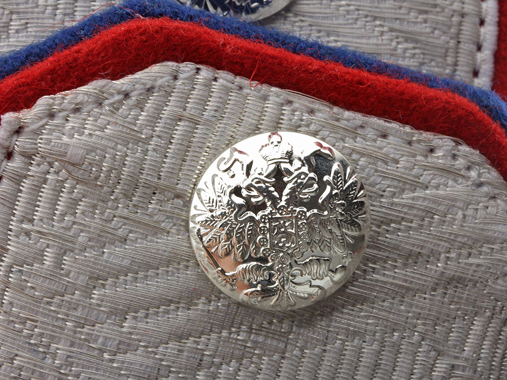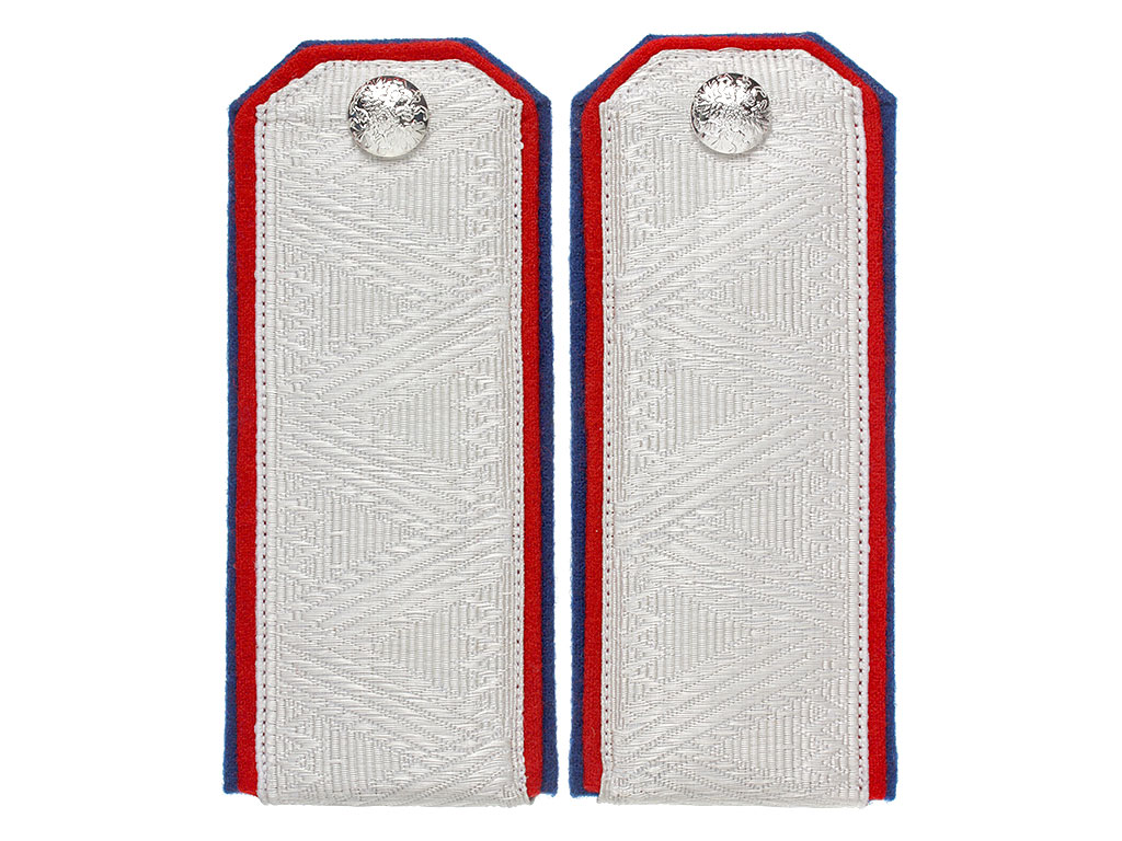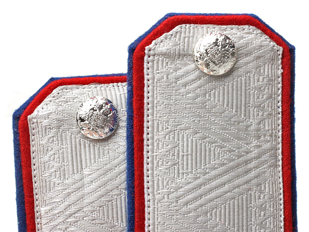 Погоны генерала от кавалерии для ношения при форме Лейб-гвардии Уланского Его Величества полка Русской Императорской Армии. Белое металлизированное серебряное поле с зигзагообразной генеральской вышивкой, красный (алый) кант с синим подбоем. Серебряные пуговицы с изображением Государственного герба.