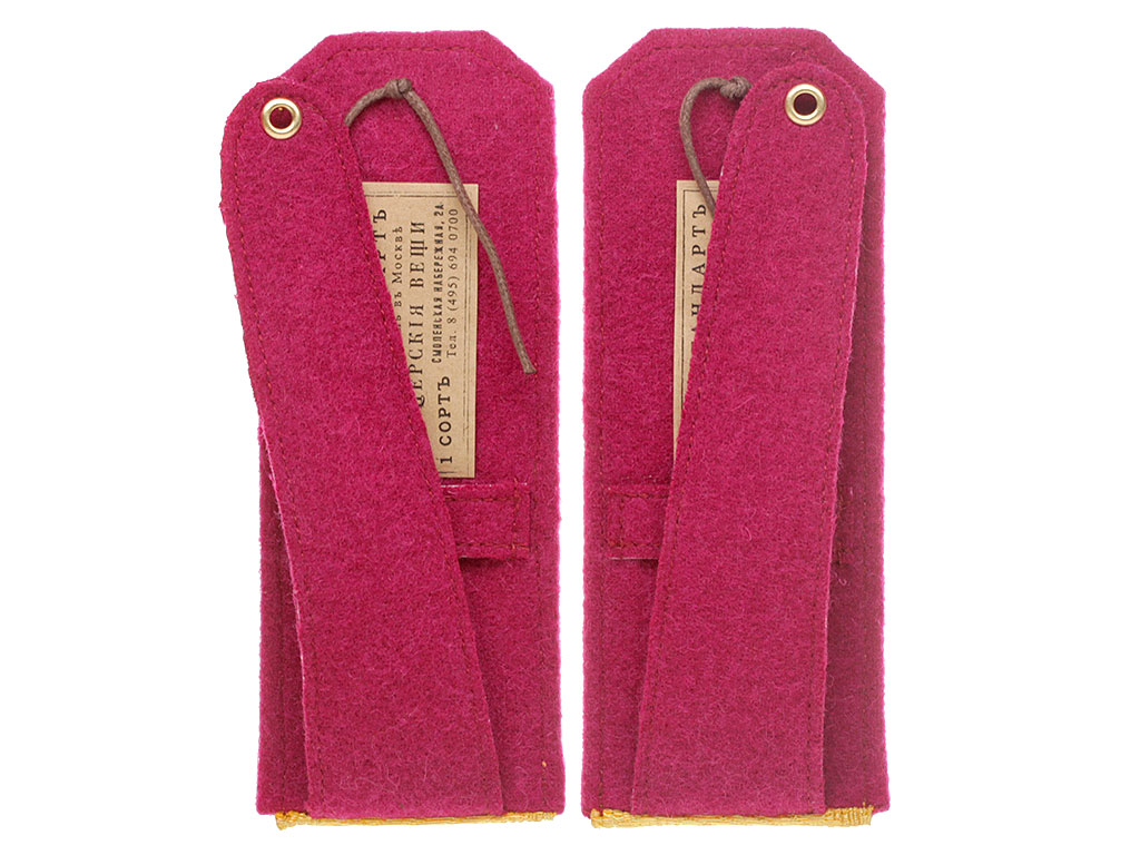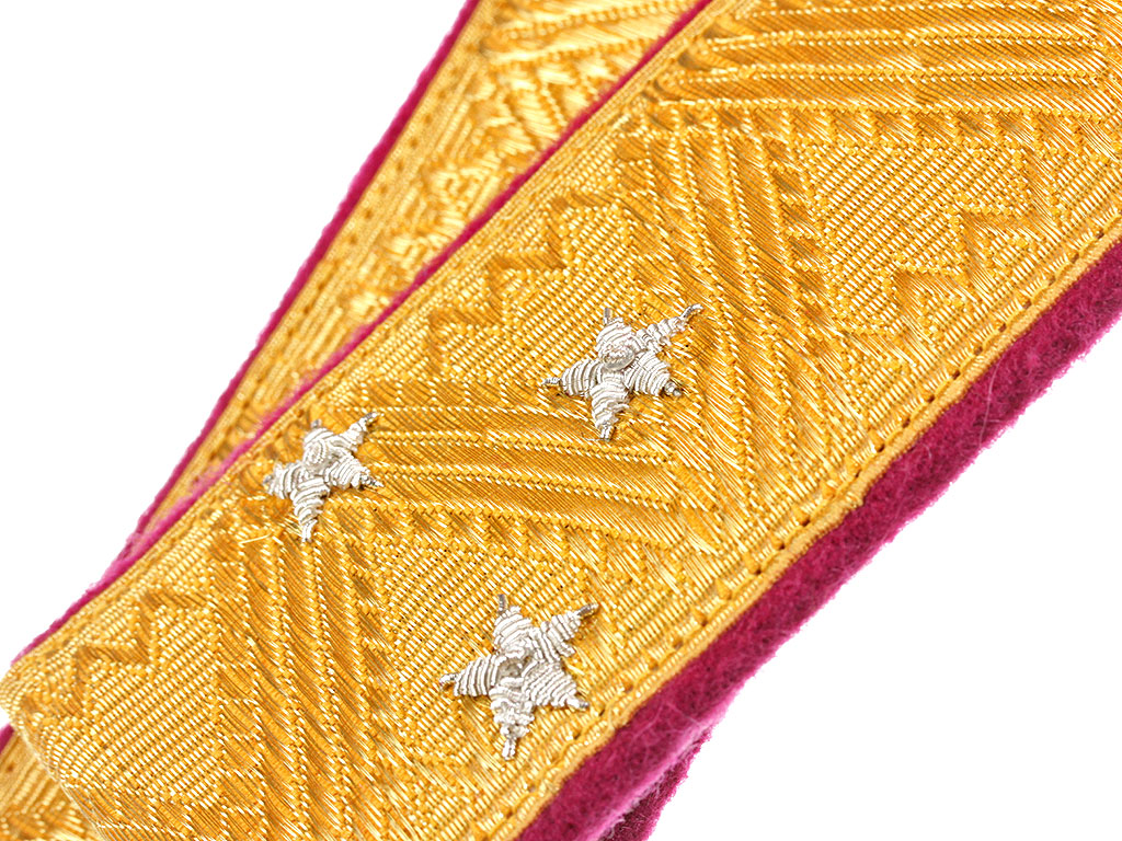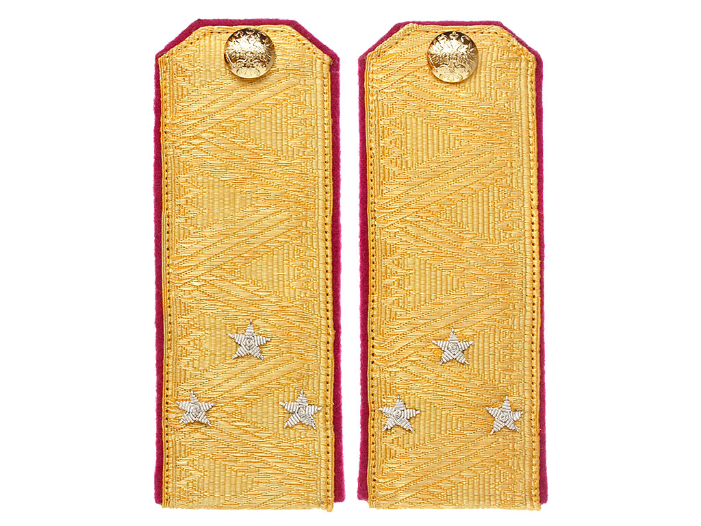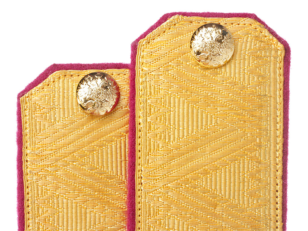 Погоны генерал-лейтенанта стрелковых полков армейских и гвардейских дивизий Русской Императорской Армии. Желтое металлизированное золотое поле с зигзагообразной генеральской вышивкой, малиновый кант, малиновая основа, шитые серебром звездочки. Золотые пуговицы с изображением Государственного герба.