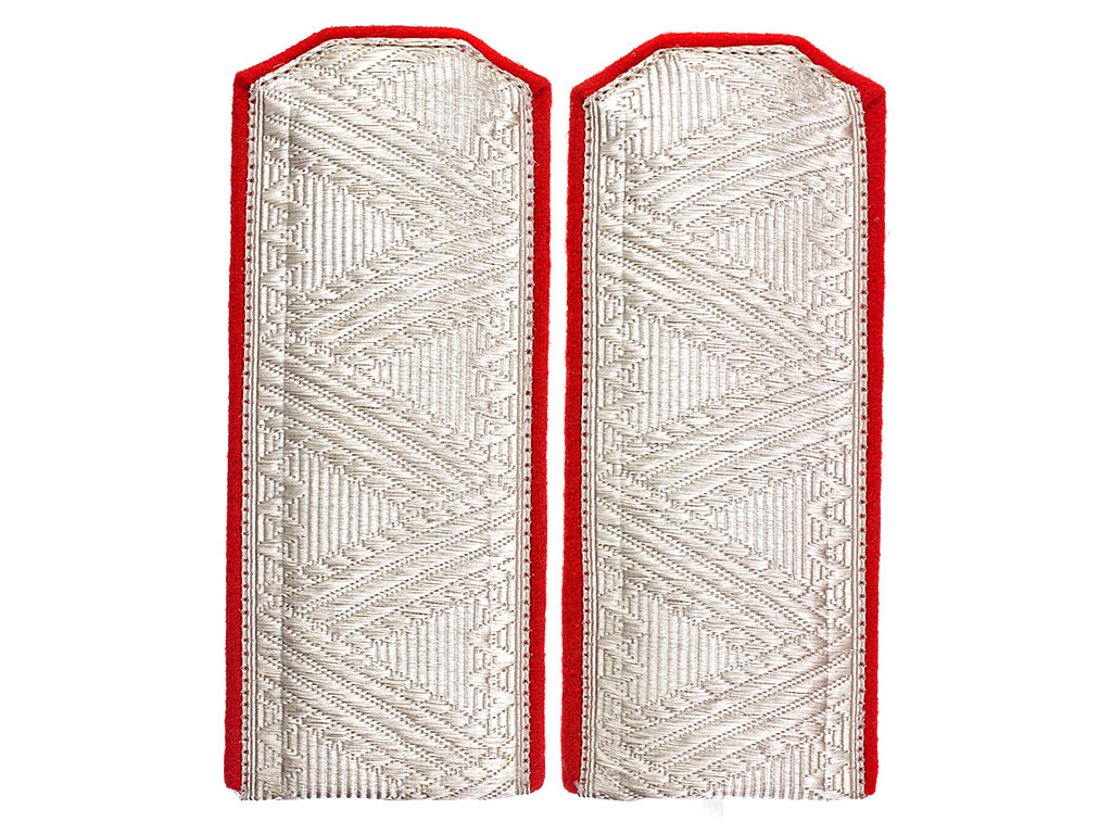 Погоны гвардейского генерала Русской Императорской Армии. Белое металлизированное серебряное поле с зигзагообразной генеральской вышивкой, красный (алый) кант.