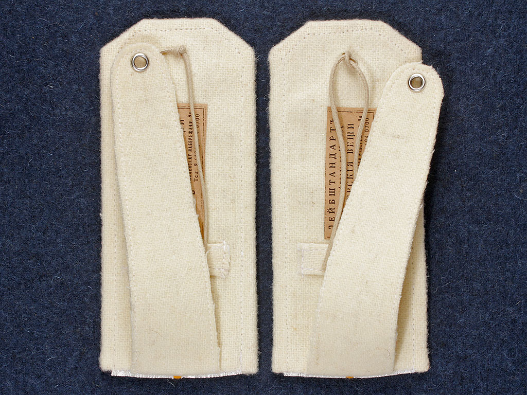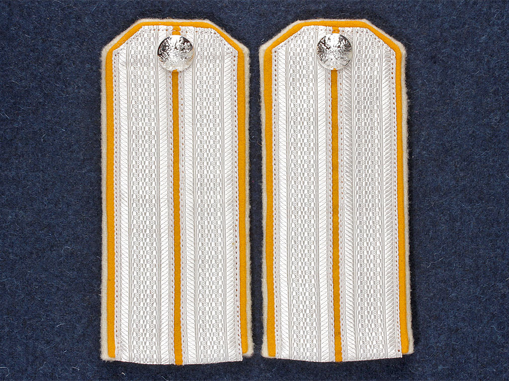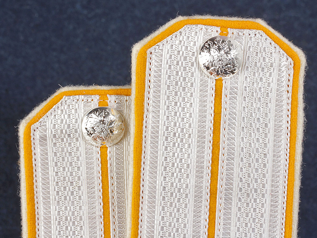 Качественная копия обер-офицерских погон Лейб-гвардии Его Величества полка ("Желтых", или "Царскосельских" кирасир). Серебряный галун, желтое поле, белый кант. Установлены серебряные пуговицы с государственным гербом.