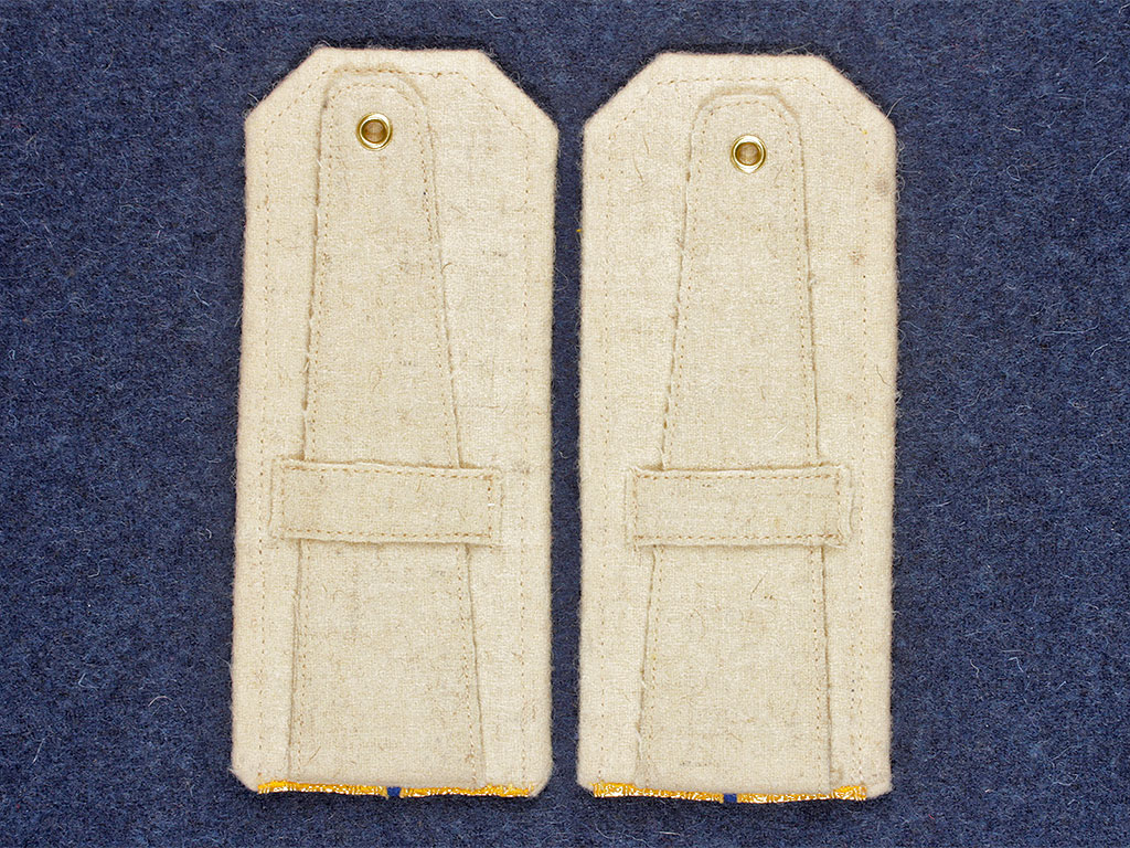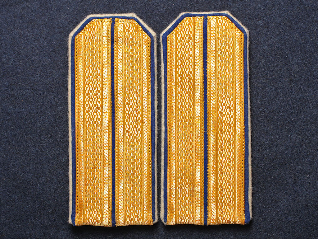 Погоны обер-офицерские Лейб-гвардии Кирасирского Её Величества Государыни Императрицы Марии Феодоровны полка РИА. Желтое металлизированное поле, синий просвет, белая основа, двойной кант (белый и светло-синий). Россия, копия