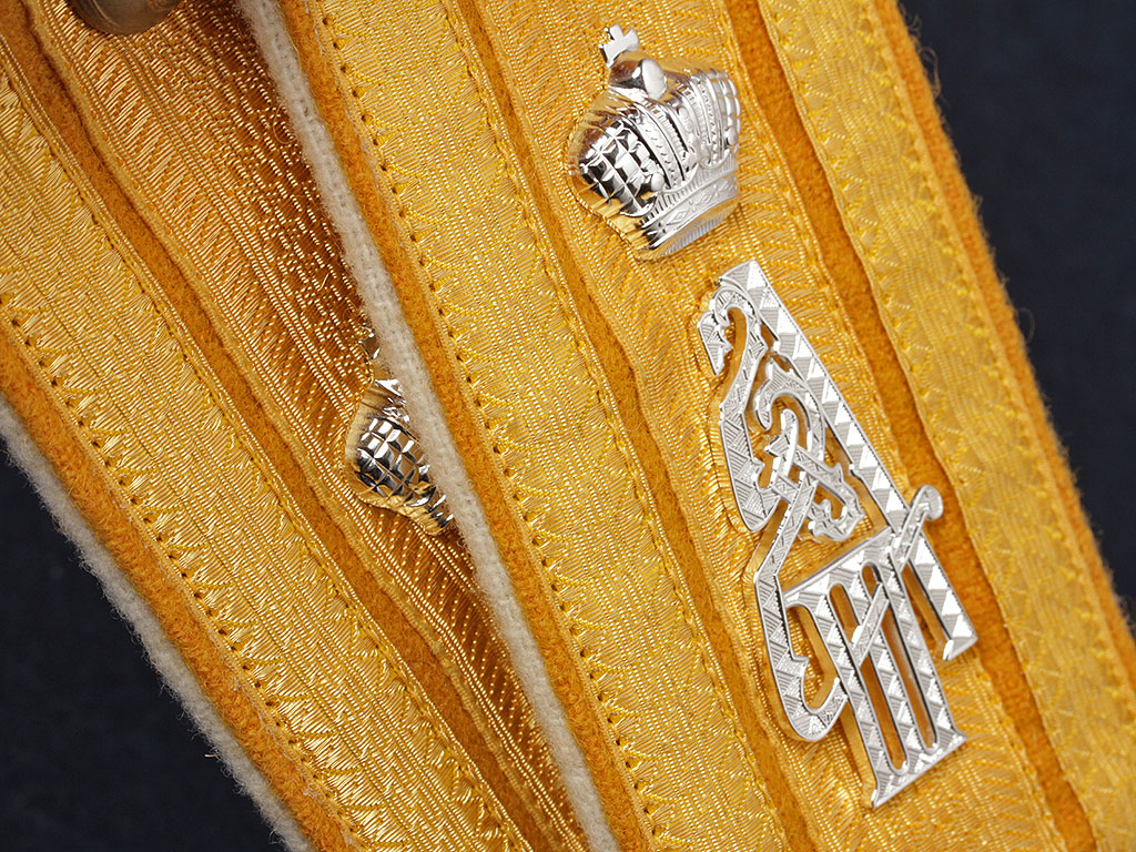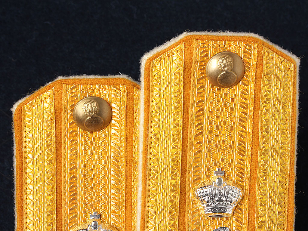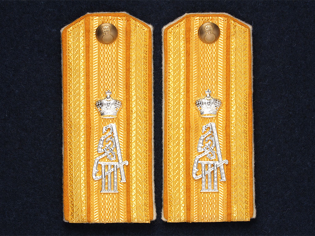 Погоны полковника 12-го гренадерского Астраханского Императора Александра III полка. Из золотого металлизированного галуна с желтыми просветами и белым подбоем, посеребренные вензеля Александра Третьего под серебряной императорской короной, латунные пуговицы с изображением пылающей гренады.
