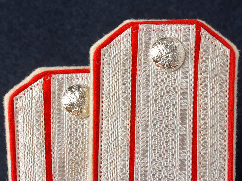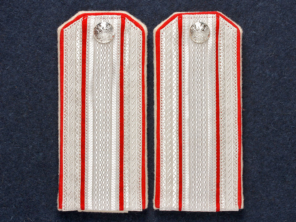 Качественная копия погон полковника Кавалергардского Ее Величества Государыни Императрицы Марии Федоровны полка. Серебряный галун, алое поле, белый кант. Установлены серебряные пуговицы с государственным гербом.