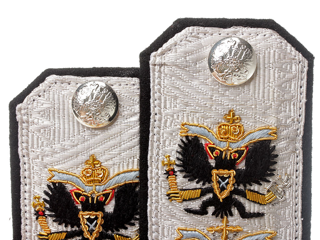Погоны повседневные генерал-адмирала Российского Императорского флота, состоящего по Адмиралтейству либо морской строительной части. За образец взяты погоны, изготовленные после 1855 года (с 1855 года использовался Государственный герб нового типа).