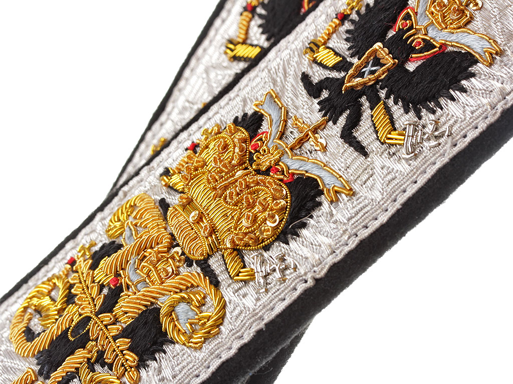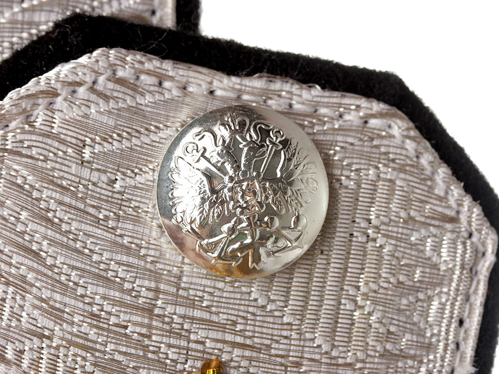 Серебряное металлизированное поле, черный кант и подложка. Серебряные пуговицы с изображением Государственного герба на якорях.