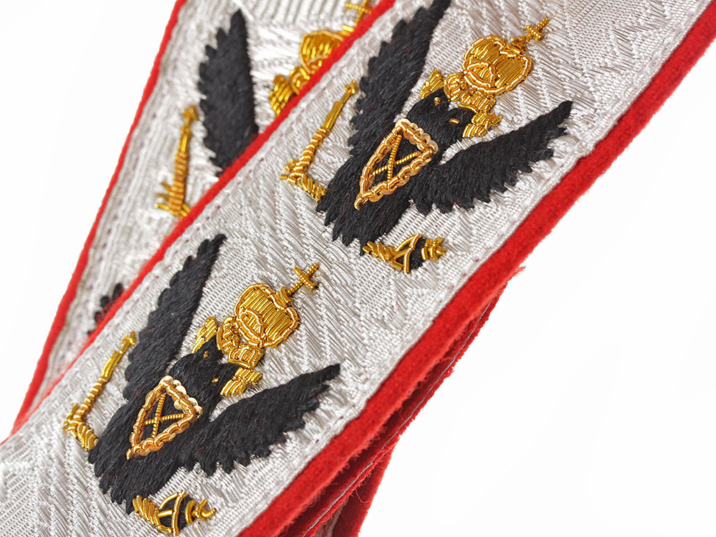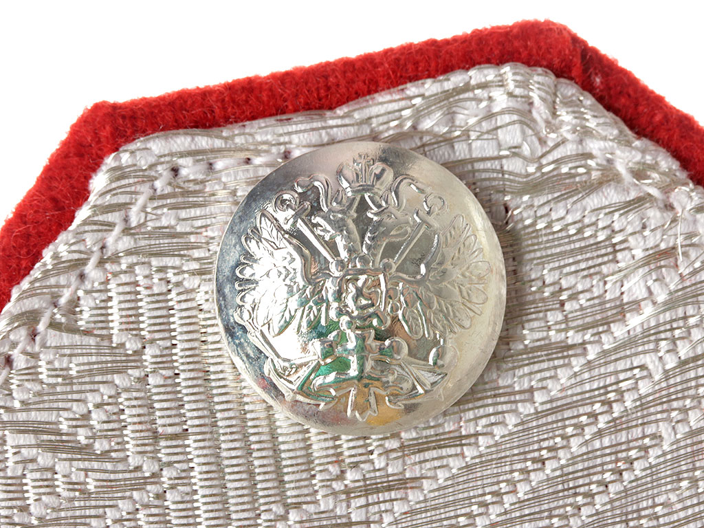 Серебряное металлизированное поле, черный кант и подложка. Серебряные пуговицы с изображением Государственного герба на якорях.