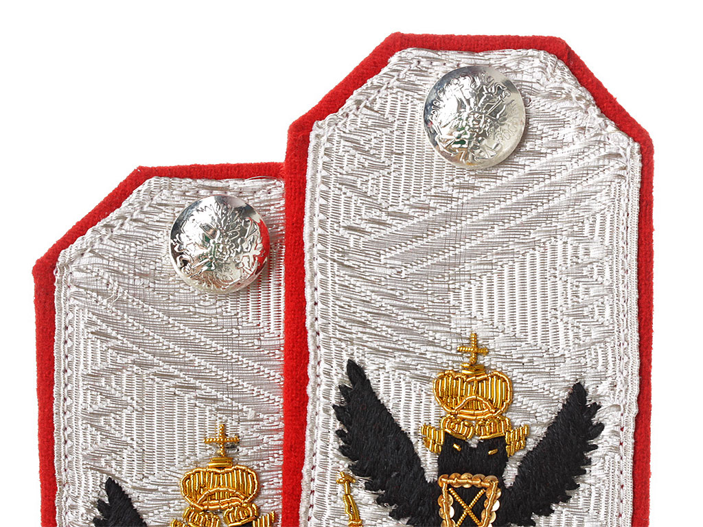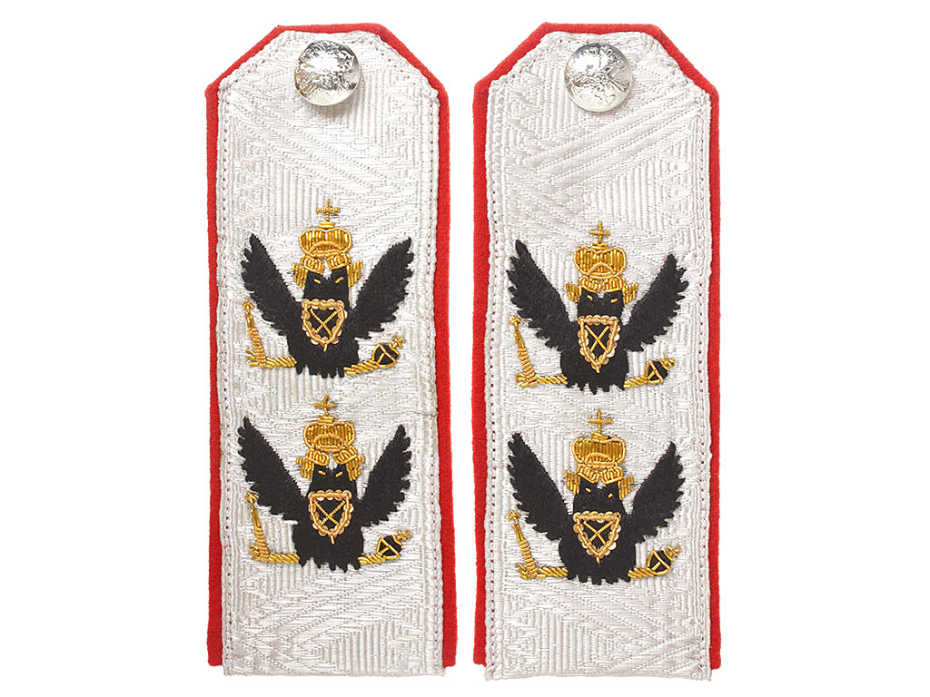 Погоны повседневные вице-адмирала Российского Императорского флота, состоящего по Адмиралтейству либо морской строительной части. За образец взяты погоны раннего типа, изготовленные до 1855 года (орлы с распростертыми крыльями, с 1855 года использовался Государственный герб нового типа).