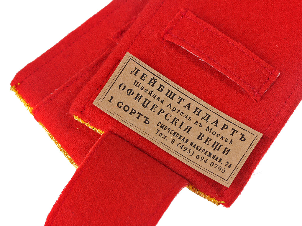 Погоны штаб-офицерские первых двух полков армейских дивизий, гвардейской пехоты, гвардейской и армейской пешей артиллерии. Желтое металлизированное поле, алый просвет, алая основа. Россия, копия