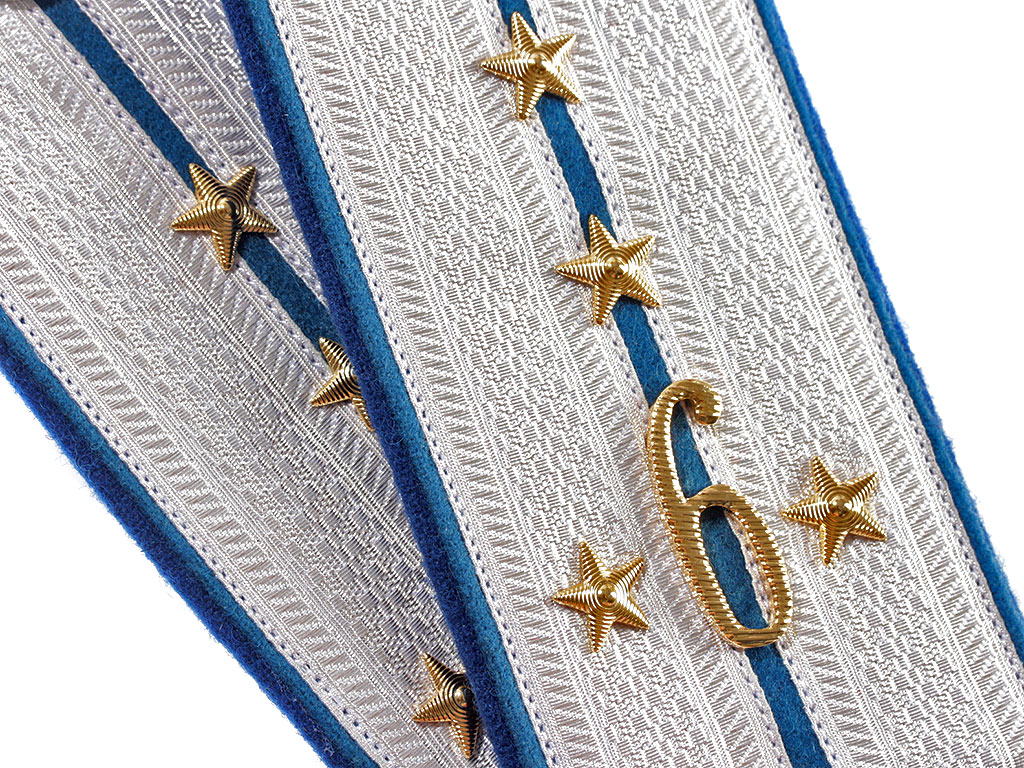 Копия высокого качества. Белое металлизированное поле, голубой просвет, синяя основа, двойной кант - синий и голубой.
