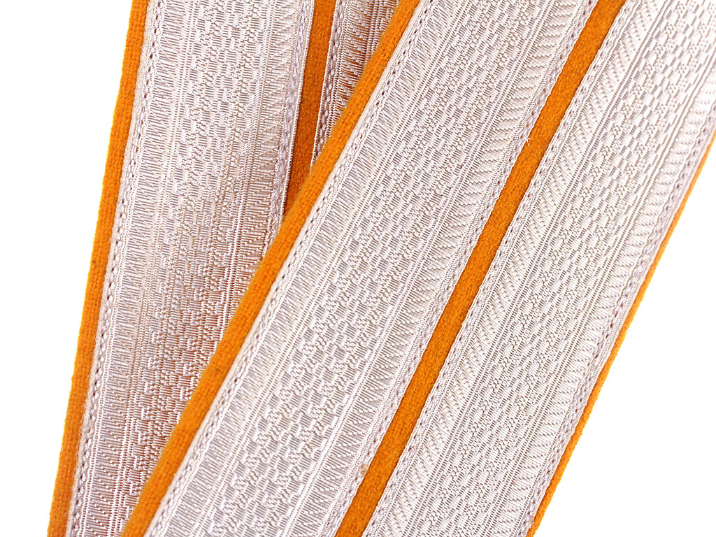 Копия высокого качества. Белое металлизированное поле, малиновый желтый, желтая основа, кант - желтый.