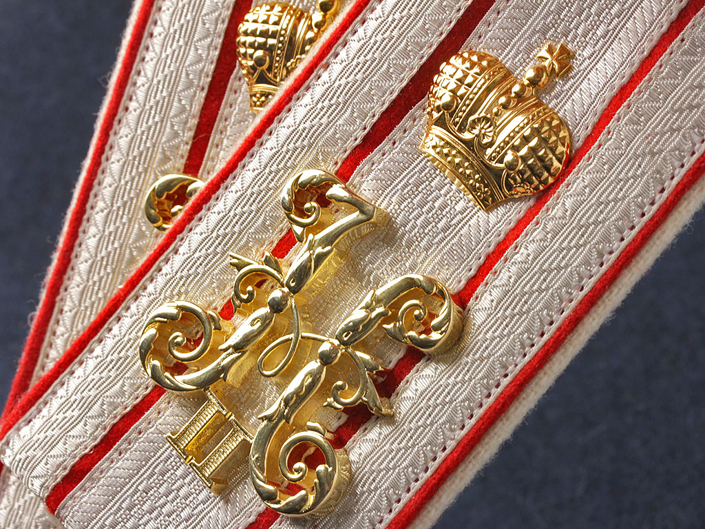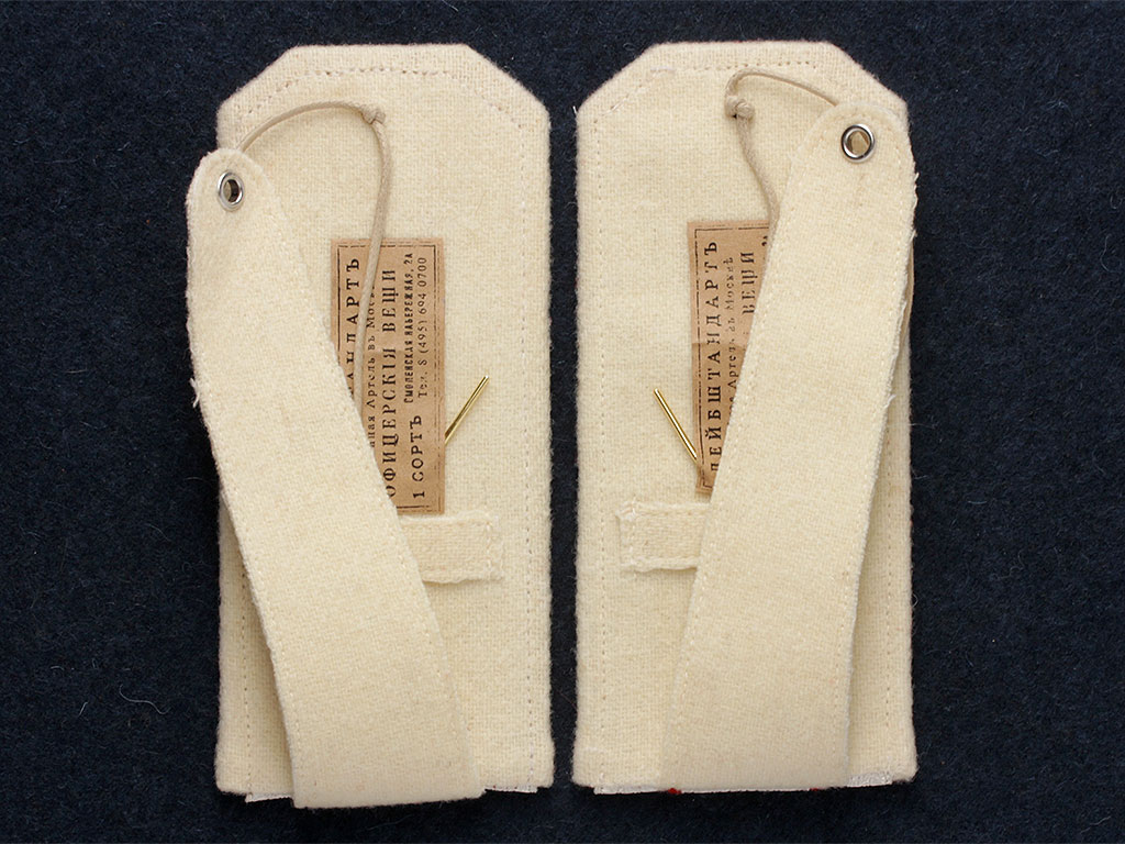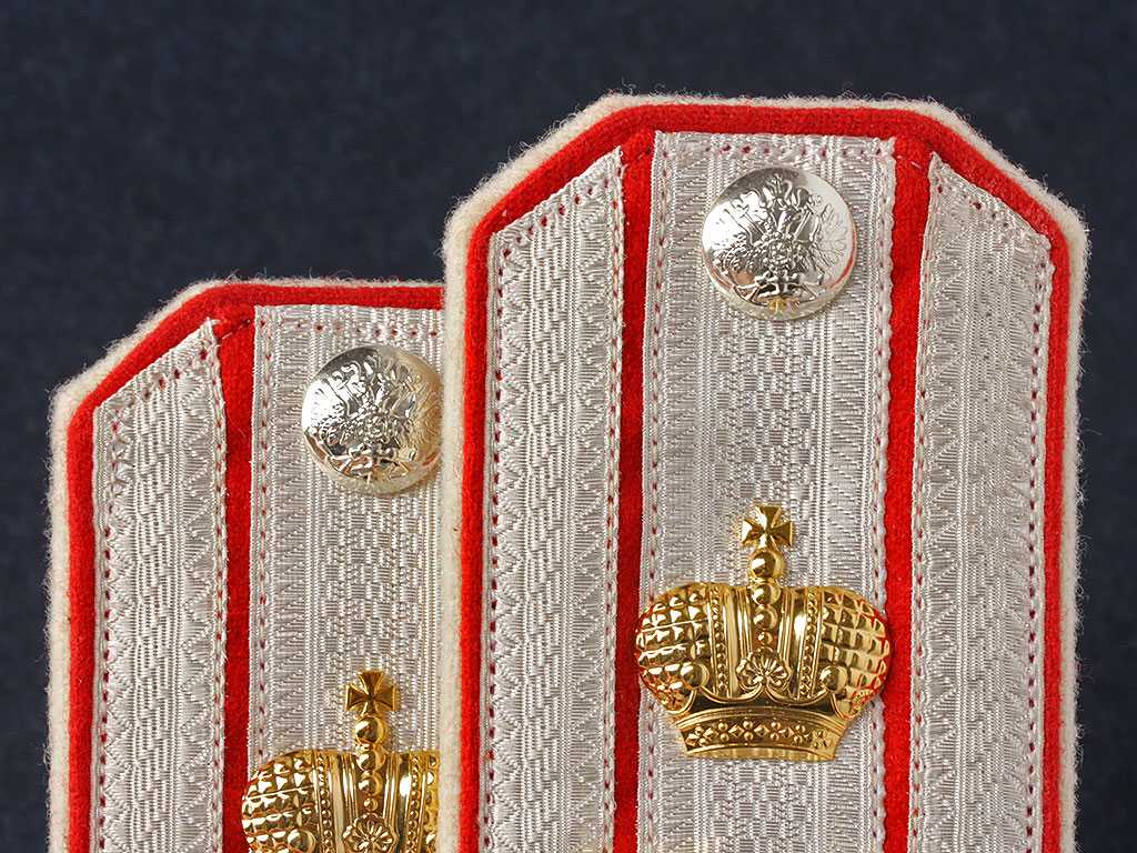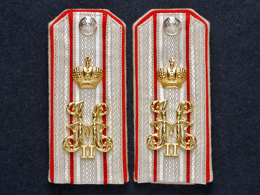 Качественная копия погон флигель-адъютанта Российского Императорского флота. Серебряный галун, красное поле, белый кант. Установлены золоченые вензеля императора Николая II под короной и серебряные пуговицы с государственным гербом, наложенным на якоря.