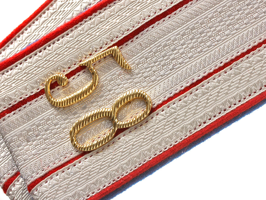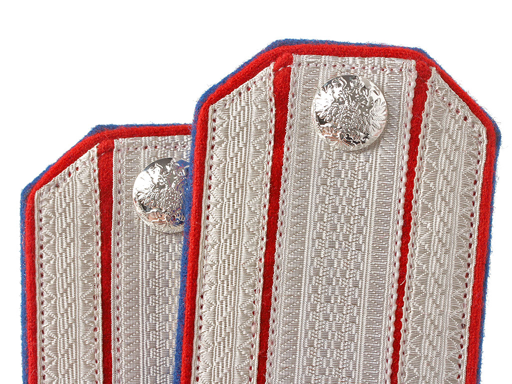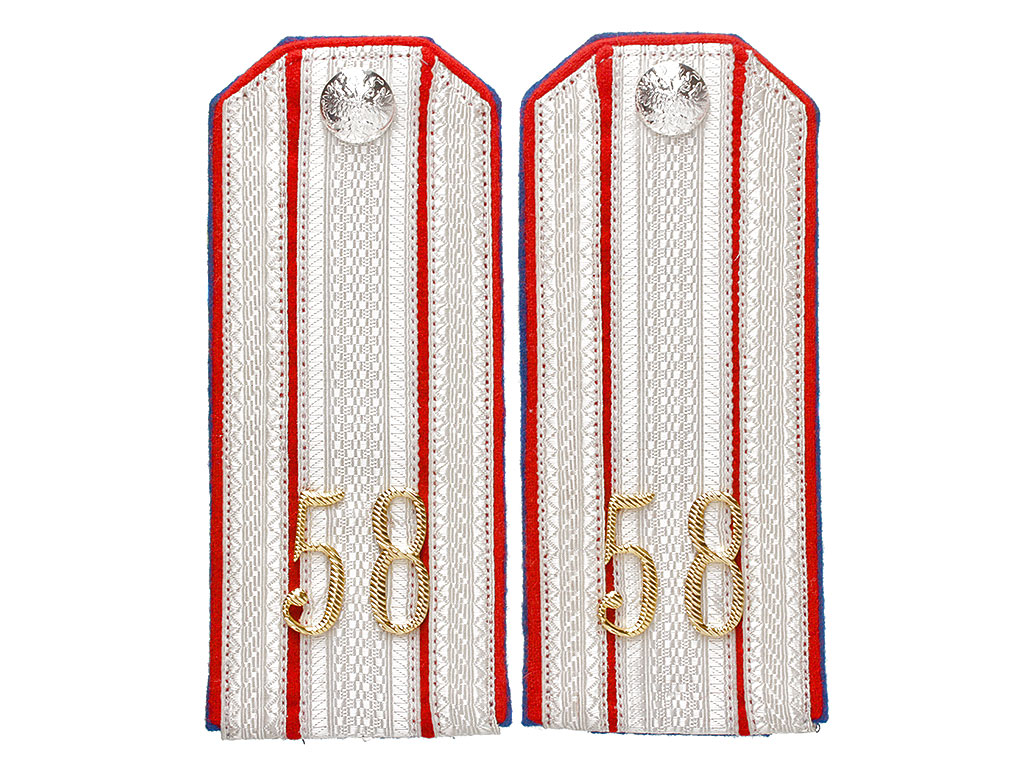 Качественная копия погон штаб-офицера - полковника 58-го Донского казачьего полка. Серебряный галун, красное поле, синий кант. Установлены золоченые цифры "58" и серебряные пуговицы с государственным гербом.