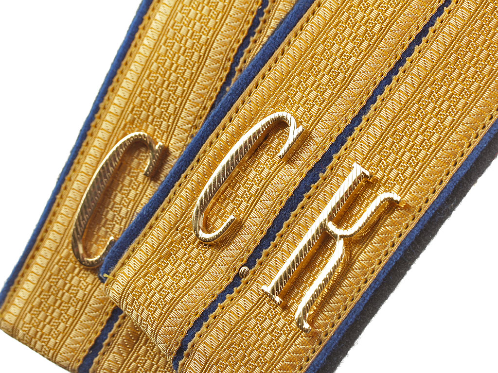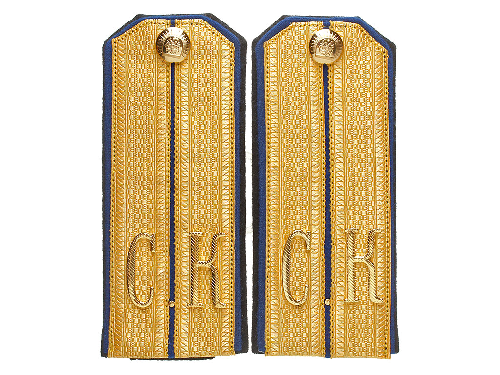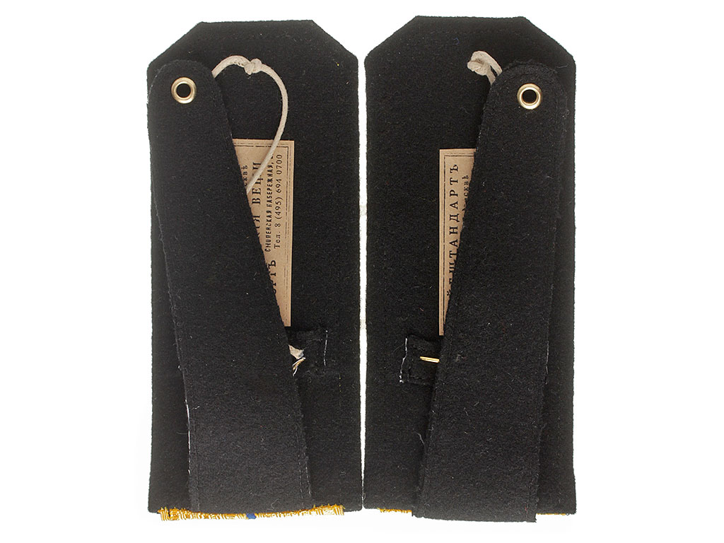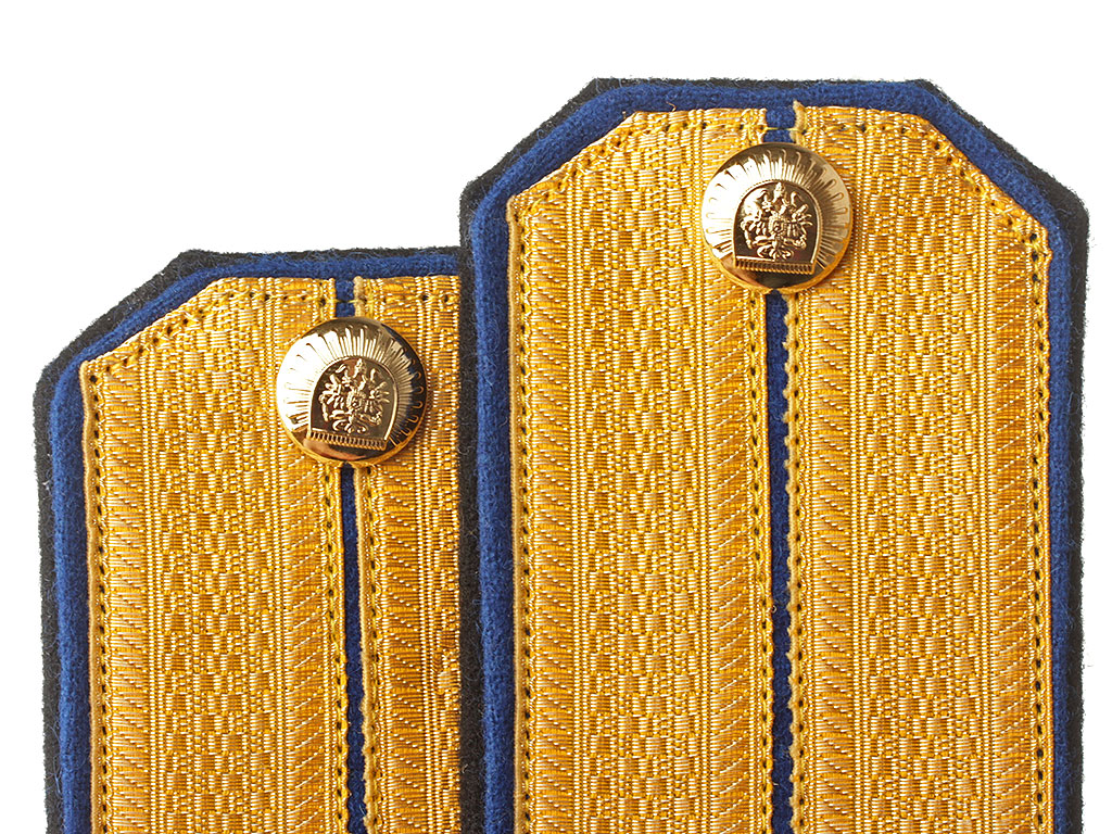 Качественная копия погон офицера - преподавателя Симбирского кадетского корпуса. Золотой галун, синее поле, черный кант. Установлены золоченые шифровки "С.К" и пуговицы с "сиянием".