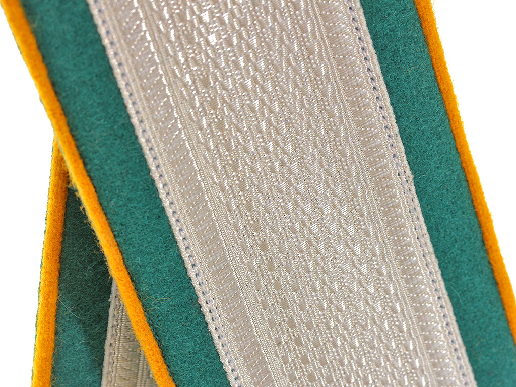 Белое металлизированное поле, зеленая основа, желтый кант.