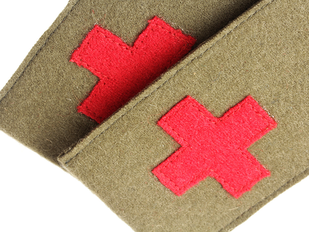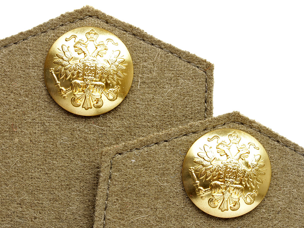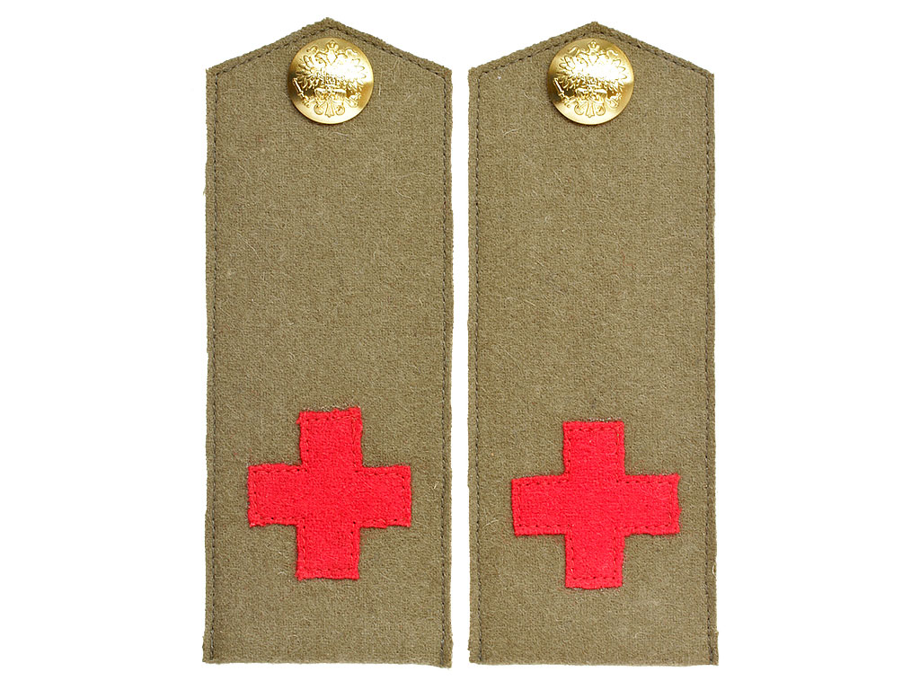 Качественная копия погон младшего медицинского персонала (санитаров) из сукна защитного цвета с нашитой эмблемой Красного Креста. Пуговицы 22 мм желтого приборного металла с изображением государственного герба. В годы Первой мировой войны такие пристежные погоны носились с походной рубахой образца 1911 года, шинелью образца 1911 года; в начальный период войны - также с походным мундиром образца 1909 года.