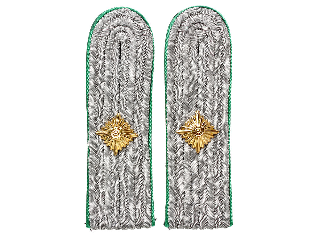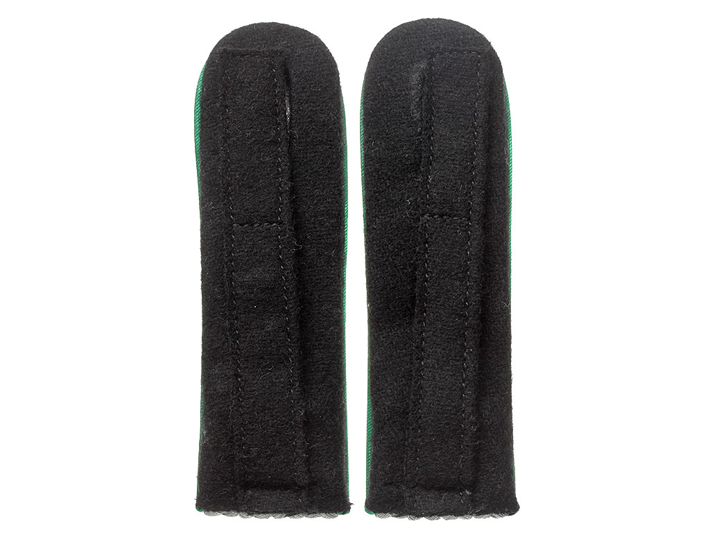 Пара погон офицера горных (егерских) Waffen-SS. Металлизированное серебристое поле, светло-зеленый кант, черная суконная подложка. На погонах установлены знаки различия оберштурмфюрера в виде одного расположенного в центре погона золотистого ромба (звездочки).