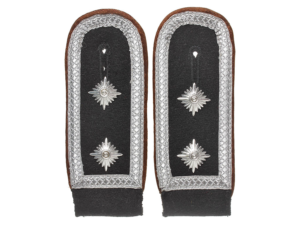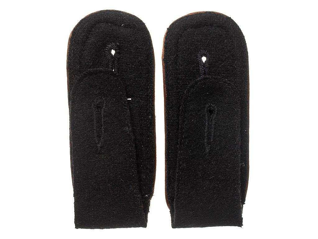 Пара погон унтер-офицера разведки Waffen-SS. Черное, обшитое серебряным галуном суконное поле, коричневый кант, черная суконная подложка. На погонах установлены знаки различия гауптшарфюрера в виде двух серебристых ромбов (звезд).
