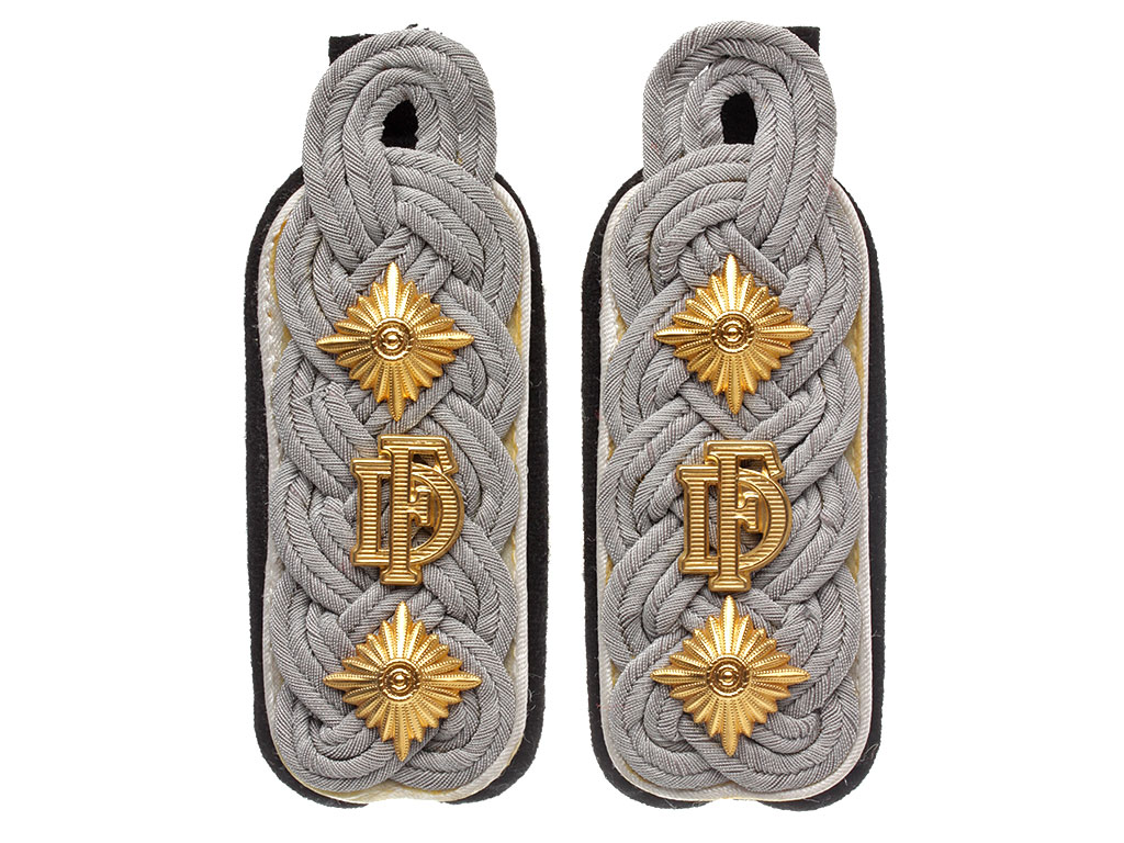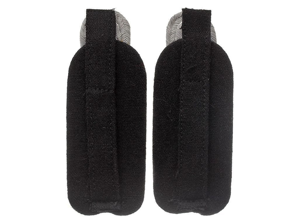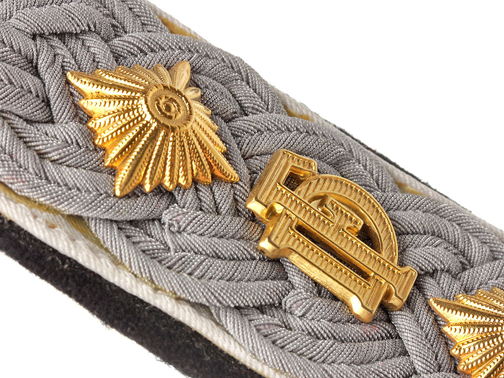 Пара погон оберфюрера дивизии Waffen-SS "Der Führer" (с 1941 года - 4-й танково-гренадерский полк Войск СС). Шитое витой серебристой нитью поле, белый кант (пехота), черная суконная подложка. С установленными званию знаками различия (двумя золотистыми ромбами, или звездами), а также золотистой шифровкой "DF".