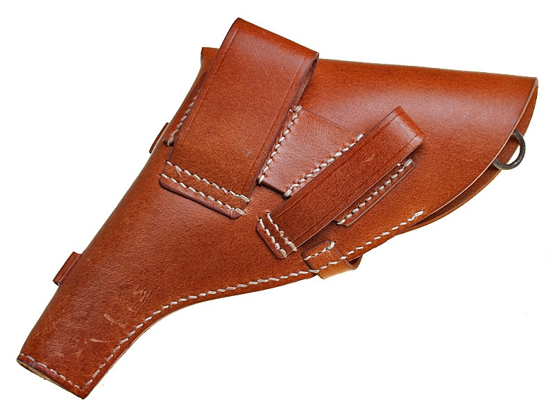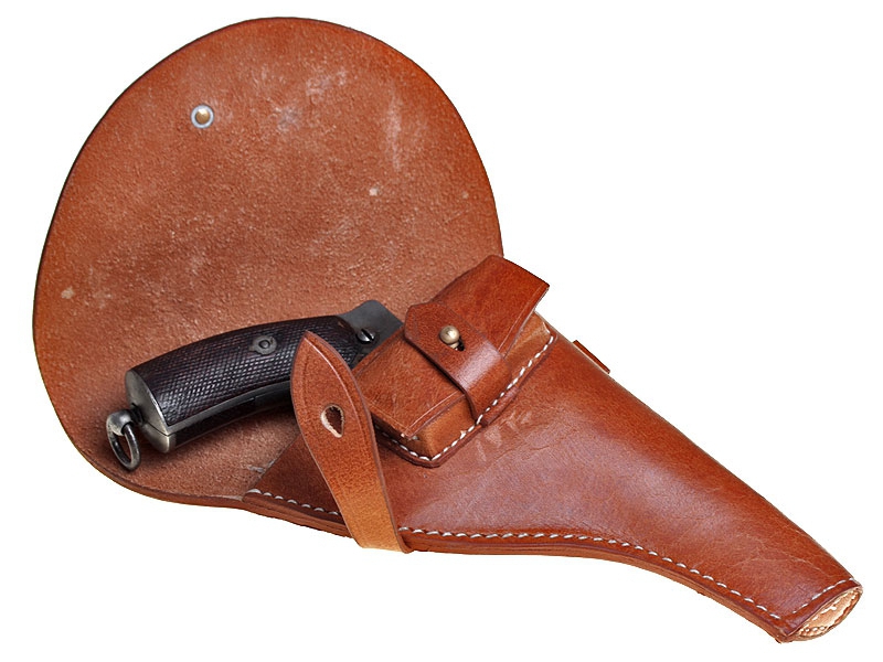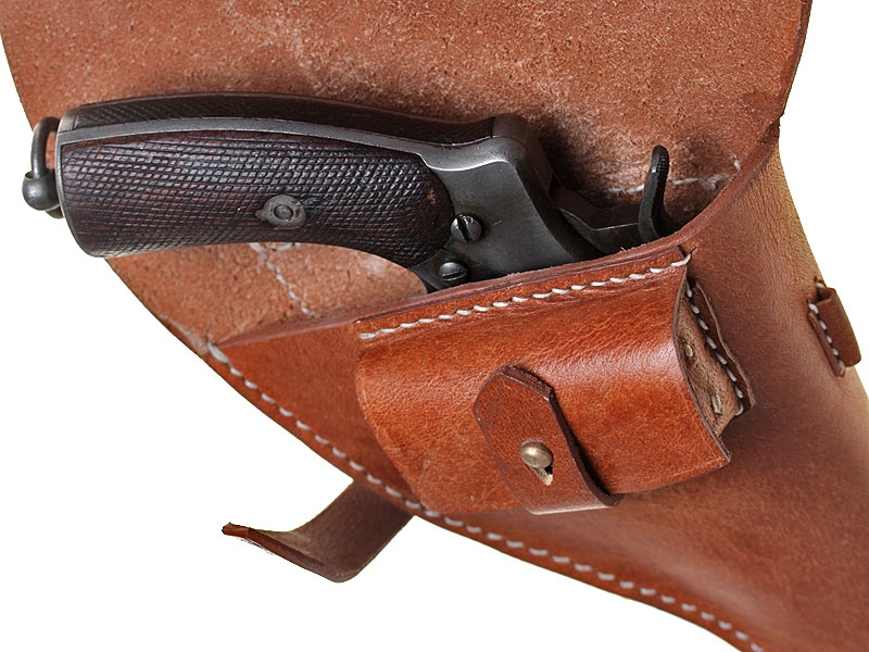 Кобура для револьвера Наган на поясной ремень, ношение рукоятью назад. Является также частью офицерского походного снаряжения.