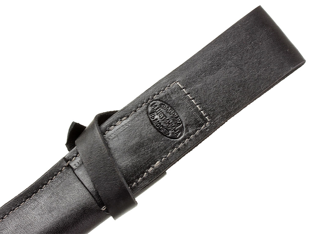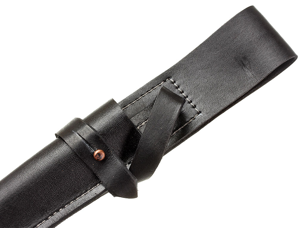 Ножны изготовлены из плотной кожи с широкой петлей для крепления на поясе подшитой к устью и удерживающим хлястиком, застегивающейся на шпенек.