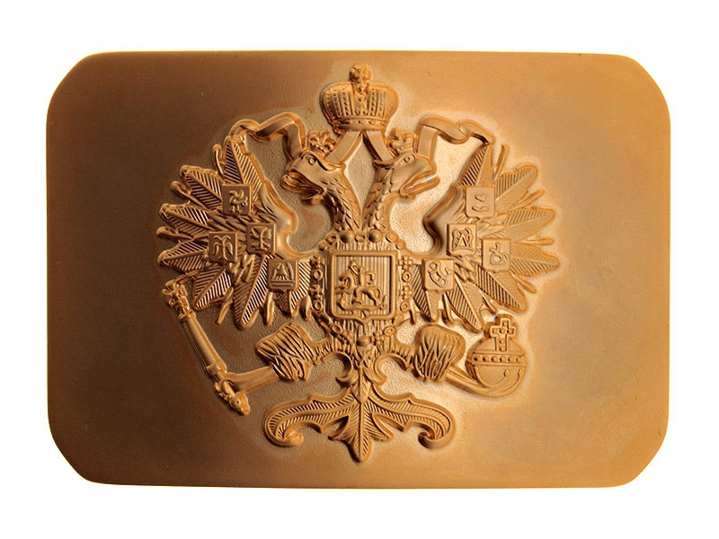 Копия бляхи нижних чинов с изображением Государственного герба. Такие пряжки носила практически вся Императорская Гвардейская и Армейская пехота, а также 2 полка гвардейских кирасир за исключением частей, где был положен белый приборный цвет металла.