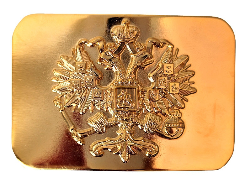 Копия бляхи парадной золоченой унтер-офицерской с изображением Государственного герба. Такие пряжки носила практически вся Императорская Гвардейская и Армейская пехота, а также 2 полка гвардейских кирасир за исключением частей, где был положен белый приборный цвет металла.