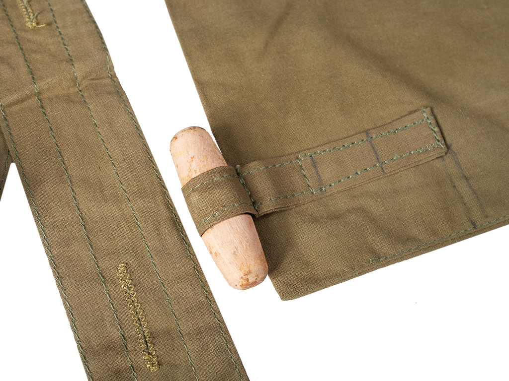 К нижнему краю мешка, на расстоянии 1/2 – 1 вершка от правого бока, пришивается из той же ткани ремешок шириною около 3/8 вершка, образовывающий петлю, в которую продевается деревянный костылек и закрепляется в ней. Петля эта, длиною 2 1/4 – 2 1/2 вершка (вдвое) пришивается так, чтобы костылек приходился ниже края мешка, а пришив петли начинался отступая 1/4 – 3/8 вершка от края мешка. Деревянный костылек, длинною около 1 1/4 вершка, а толщиною около 1/2 вершка заострен к концам и имеет посередине выточку по ширине петли.