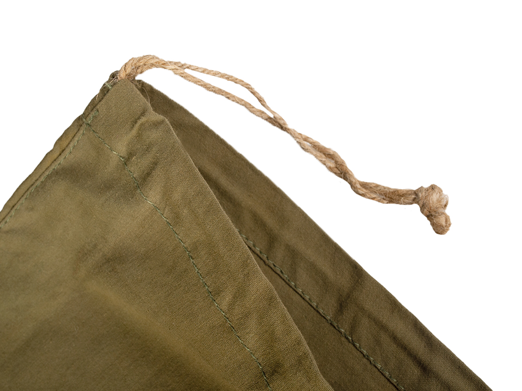 У отверстия мешка край ткани загибается внутрь и образует рубец (борт) шириною около 5/8 вершка. Край рубца прострачивается и, в случае отсутствия кромки, подрубливается с подгибом ткани примерно на 1/8 – 3/16 вершка. В образованный таким образом рубец, внутри его, для стягивания отверстия мешка пропускается прочная бечевка длиною не менее 2 аршин, выпуская концы ее наружу.